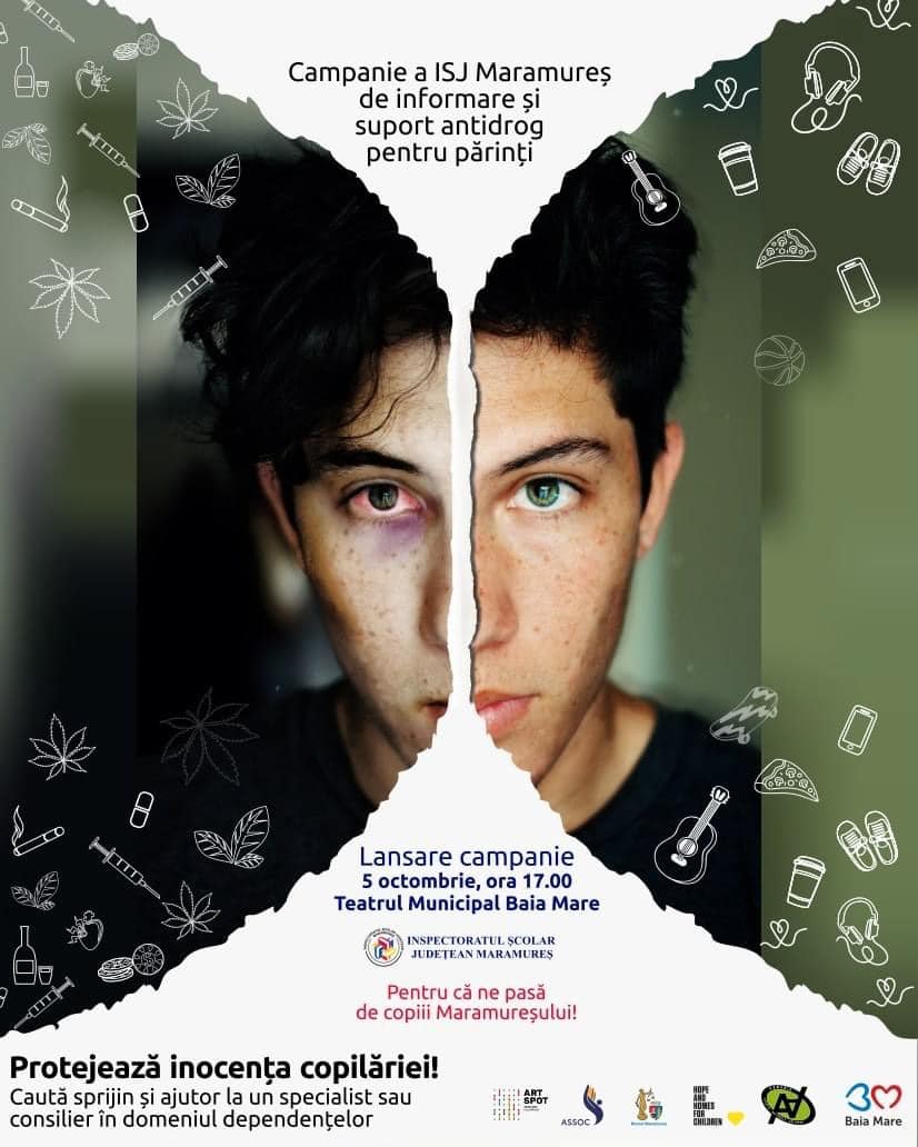 Această campanie se dorește a fi una de informare și suport antidrog pentru părinți. Campania „Protejează inocența copilăriei!” se va lansa la ora 17,00, la Teatrul Municipal din Baia Mare. Organizatorii îndeamnă la căutarea unui sprijin și a unui ajutor la un specialist sau consilier în domeniul dependențelor.