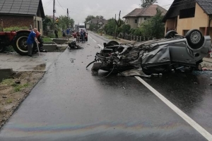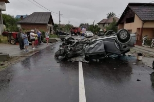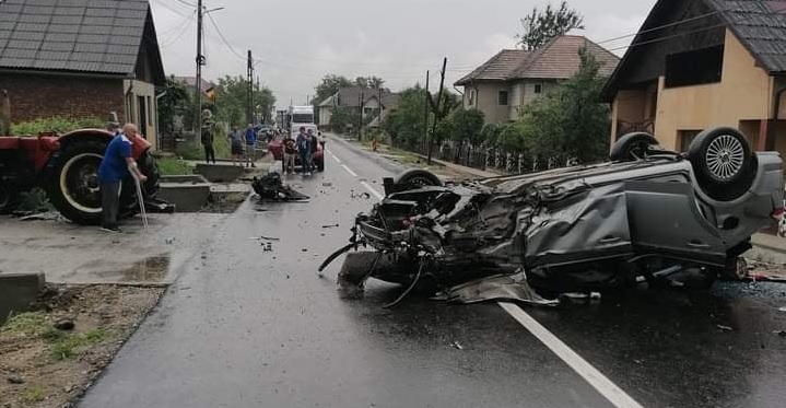 Actualizare: Alertă: Un maramureșean s-a răsturnat cu mașina pe plafon după ce a lovit un podeț, un tractor și un autoturism parcat. Doi bărbați răniți! (FOTO)