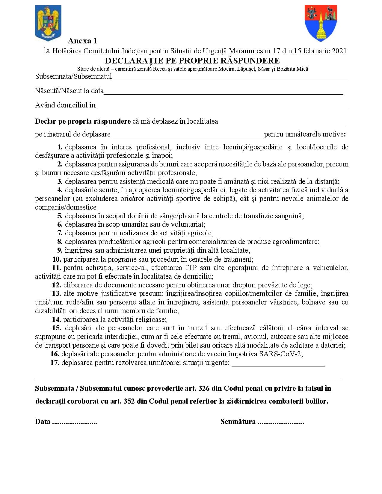 Președintele Comitetului Județean pentru Situații de Urgență Maramureș, prefectul Nicolae-Silviu Ungur, a declarat că s-au primit ordinele Șefului Departamentului pentru Situații de Urgență, Secretar de Stat Dr. Raed Arafat privind instituirea măsurii de carantinare zonală pentru localitatea Remetea Chioarului, respectiv localitatea Recea și satele aparținătoare Mocira, Săsar, Lăpușel și Bozânta Mică. Ordinele au intrat în vigoare de astăzi, 15 februarie a.c., pentru o perioadă de 14 zile.