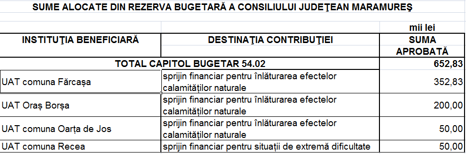 La ultima ședință a CJ Maramureș, un oraș (Borșa) și două comune (Fărcașa și Oarța de Jos) au primit bani pentru înlăturarea efectelor calamităților naturale, iar comuna Recea – pentru situații de extremă dificultate. La Fărcașa calamitatea naturală ține mai mult de alunecările de teren din zona investiției pentru Centrul de Management Integrat al Deșeurilor. Desigur, intervenția artificială impusă de construirea centrului a determinat alunecările de teren, care sunt cât se poate de naturale. Și care necesită o intervenție promptă, dacă se mai dorește salvarea proiectului ”Sistem de Management Integrat al Deșeurilor” (SMID). De fapt, salvarea a vreo 70.000.000 de euro, care ar trebui returnați dacă se ratează proiectul. Dar iată care sunt sumele alocate.
