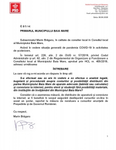 „S-a efectuat sau se are în vedere a se efectua o analiză legală, bugetară și procedurală asupra costurilor și posibilității distribuirii din partea Municipiului Baia Mare de aparate adecvate (tabletă sau calculator) și conexiune la internet, pentru elevii și studenții fără posibilități materiale, din instituțiile de învățământ din Municipiul Baia Mare?” – este întrebarea adresată de Marin Brăgaru.