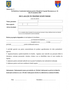 În aplicarea prevederilor Ordinului Șefului Departamentului pentru Situații de Urgență nr. 4659722/2020 privind instituirea carantinei zonale în localitatea Vișeu de Jos, județul Maramureș, se aprobă modelul de Declarație pe proprie răspundere din care să rezulte motivul justificat al deplasării conform Anexei nr. 1 care face parte integrantă din prezenta hotărâre. Alte măsuri pentru prevenirea și combaterea SARS-CoV-2, precum și pentru soluționarea unor probleme deosebite pe perioada carantinei vor fi stabilite prin Centrul Județean de Coordonare și Conducere a Intervenției Maramureș. Măsurile stabilite vor fi comunicate autorităților locale și aduse la cunoștința populației, inclusiv prin utilizarea sistemului RO-ALERT, a mai adăugat prefectul de Maramureș.
