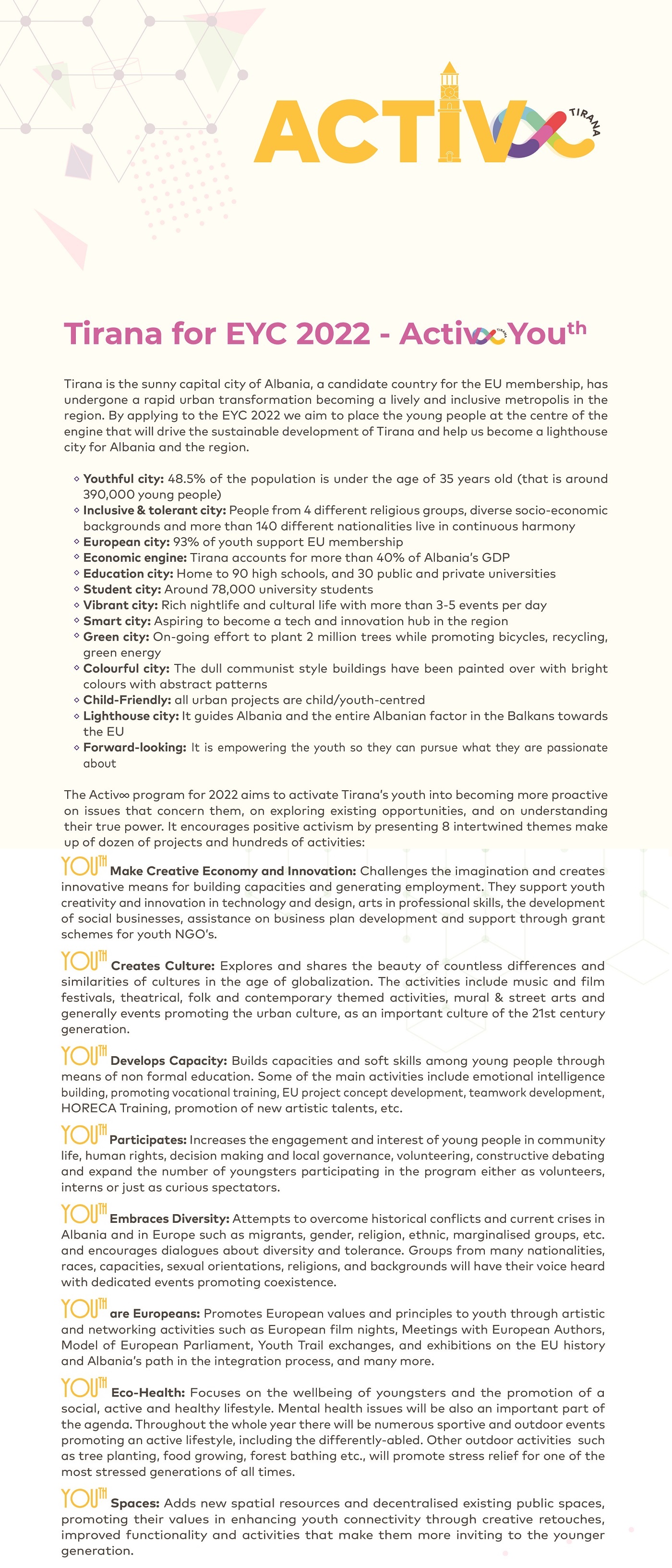 S-a spus simplu și exact ”Felicitări Tirana, Capitală Europeană a Tineretului 2022!” Căci dintre cele cinci finaliste – Tirana (Albania), Baia Mare (România), Kazan (Rusia), Poznan (Polonia), Varazdin (Croaţia) – Forumul European al Tineretului a optat pentru Tirana.