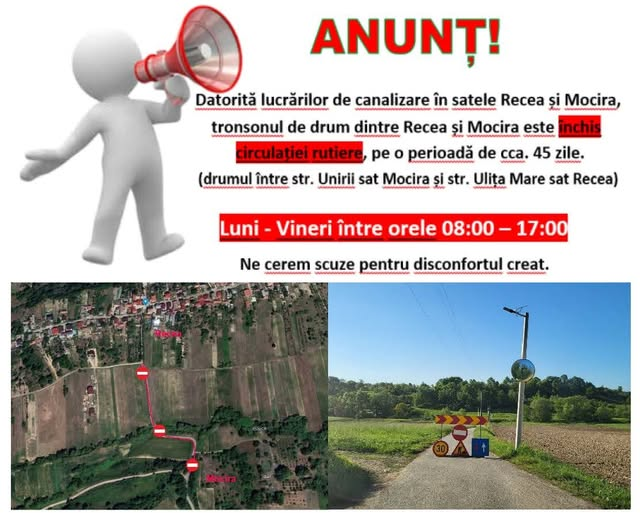 În scopul modernizării infrastructurii și pentru a îmbunătăți condițiile de trai, au început lucrările de canalizare în aceste zone, ceea ce implică o serie de restricții temporare de trafic. Astfel, tronsonul de drum ce leagă localitățile Recea și Mocira va fi închis circulației rutiere pentru o perioadă estimată de aproximativ 45 de zile. Închiderea afectează drumul situat între strada Unirii din satul Mocira și strada Ulita Mare din satul Recea și se va aplica în zilele lucrătoare, de luni până vineri, între orele 08:00 și 17:00.