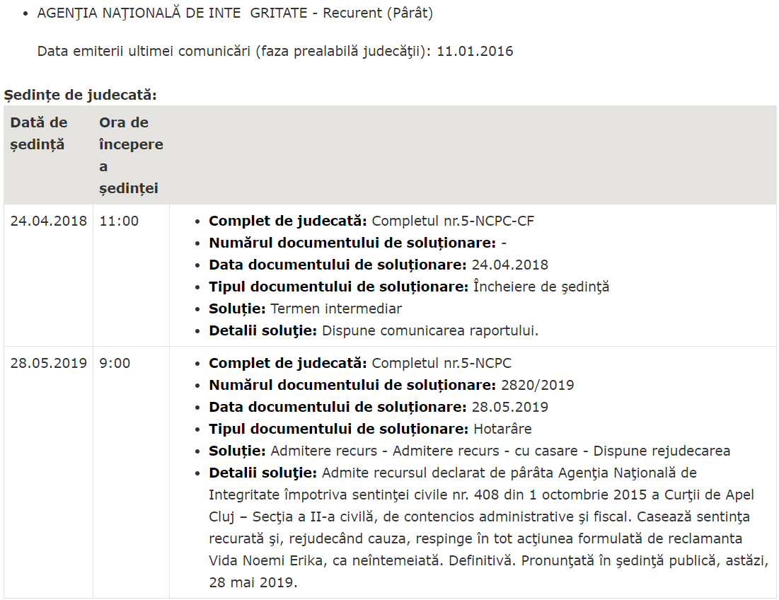 Reprezentanta Opus Media s-a opus, adresându-se Curții de Apel Cluj-Napoca. În toamna anului 2015, aceasta a admis doar parțial raportul ANI. A urmat recursul agenției, care a intrat pe rol la Înalta Curte de Casație și Justiție în aprilie 2018. Iar în 28 mai 2019, recursul ANI a fost admis, așa încât starea de incompatibilitate pentru Noemi Vida a rămas definitivă. În aceste condiții Noemi Vida va pleca de nevoie și din Consiliul Local (urmând ca UDMR să nominalizeze înlocuitorul), dar și din funcția de viceprimar. Pentru care, în culise, se încălzesc destui – îndreptățiți sau nu – să ocupe fotoliul devenit liber.