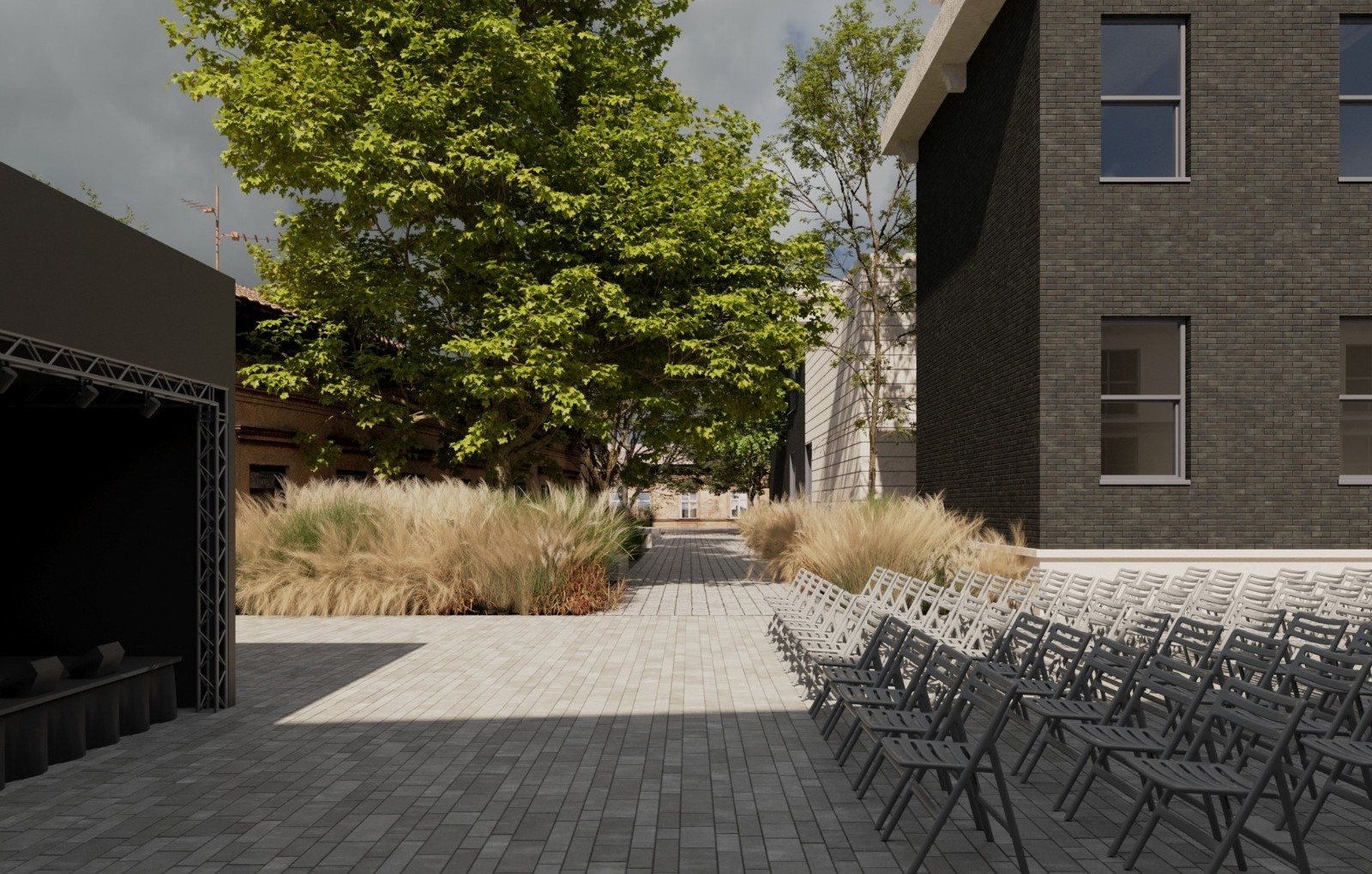 - amenajarea curților și grădinilor cu pavaje din piatră naturală și cubică, zone verzi, mobilier urban, construirea unei fântâni arteziene și a unei zone de spectacole și evenimente în aer liber
