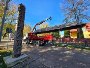 Poarta maramureșeană de la intrarea în Parcul „Grădina Morii” din Sighet, demontată pentru a fi recondiționată