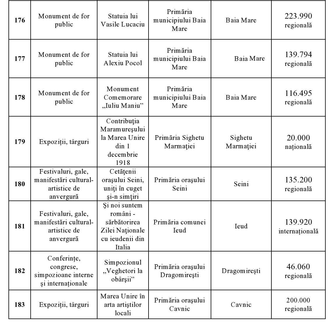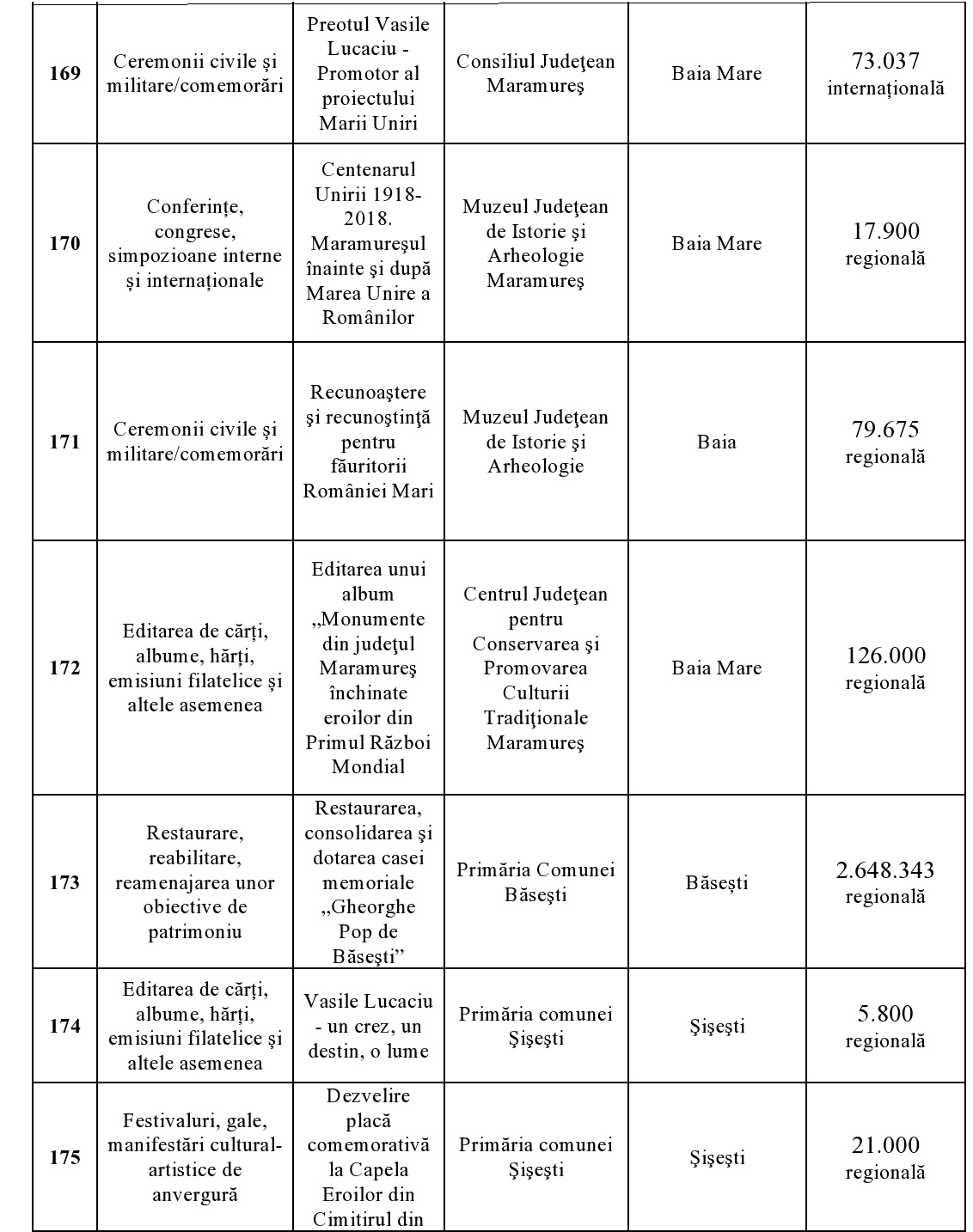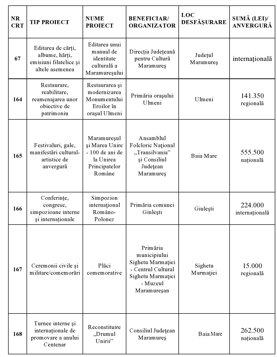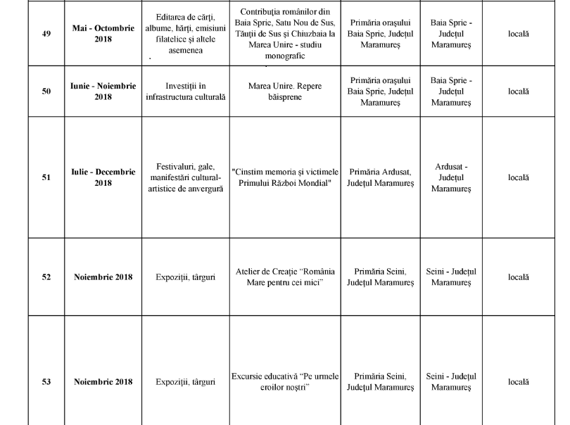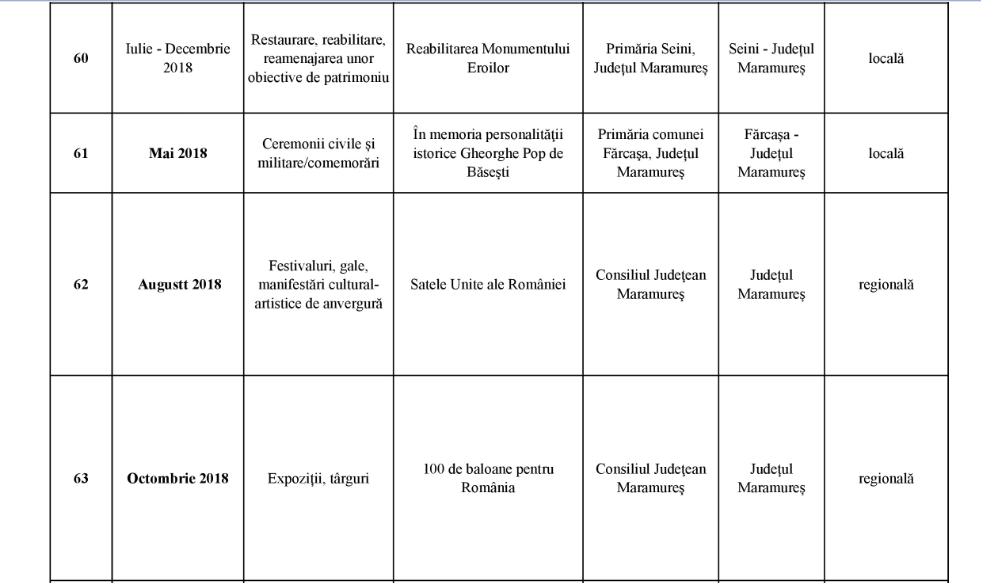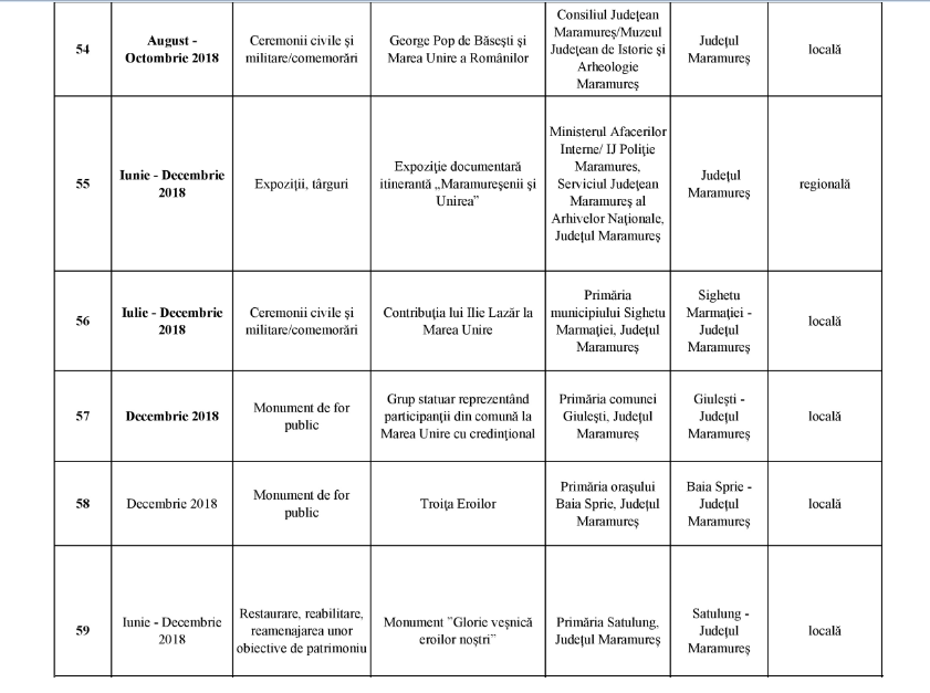 În cadrul reuniunii din 23 aprilie, Comitetul Interministerial pentru Centenar a aprobat următoarele proiecte din Maramureș, valorile cele mai mari – câte 400.000 lei fiecare – fiind acordate pentru ”Satele Unite ale României” și ”100 de baloane pentru România”.