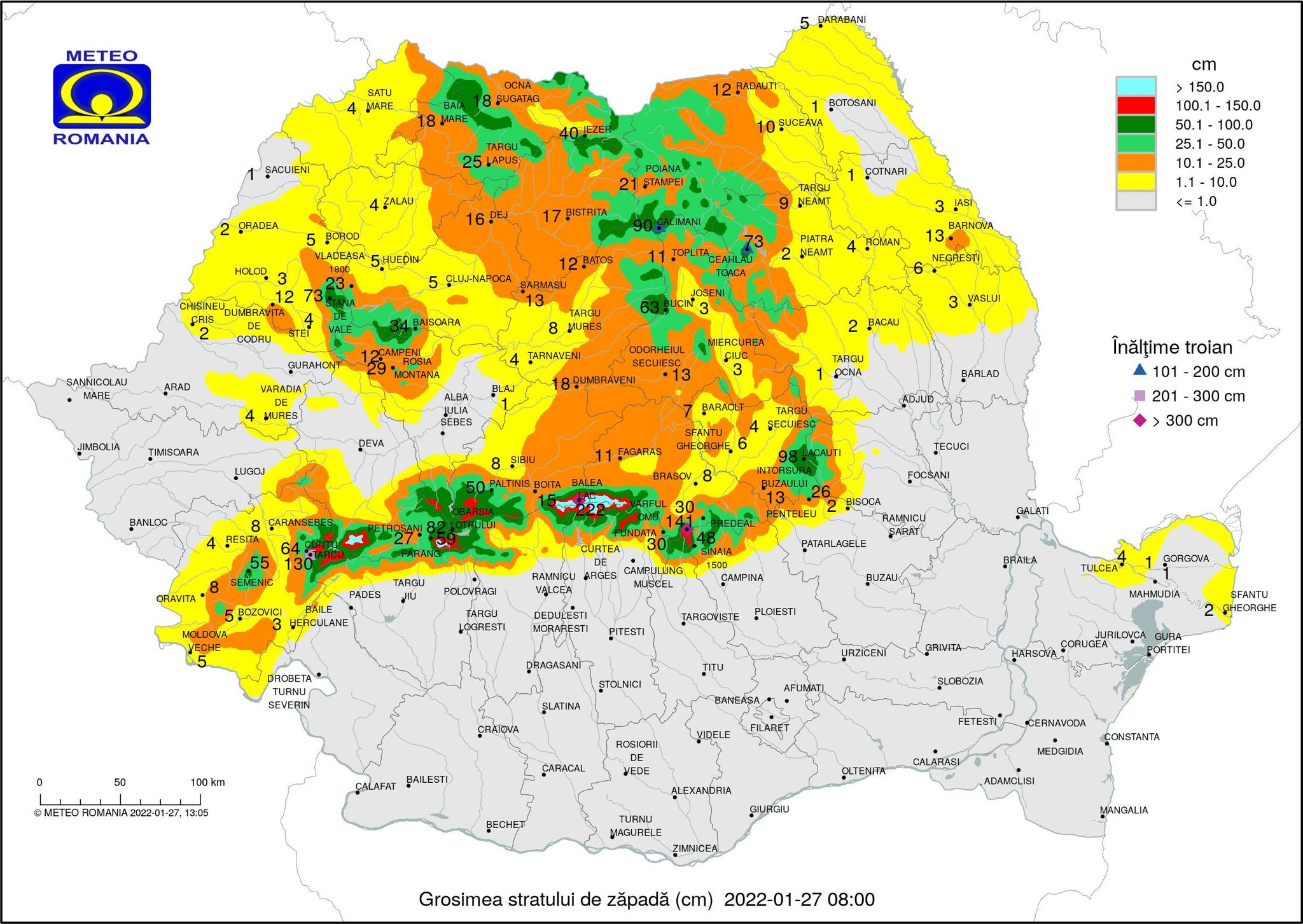 Vizibilitatea este redusa de ceata, sub 150 de metri pe intreg sectorul DN18, in Pasul Prislop. Vantul prezinta intensificari in zona inalta de munte unde viscoleste ninsoarea si spulbera zapada. Stratul de zapada masura pana la 40 cm la statia meteo Iezer, 46 cm la Firiza, 36 cm in Pasul Gutai, 35 cm la Cavnic, 34 cm la Baiut, 28 cm in Baia Borsa, 27 cm in Poiana Borsa, 25 cm la Targu Lapus, 18 cm in Baia Mare si Ocna Sugatag, 17 cm la Sighetu Marmatiei. Debitele si nivelurile cursurilor de apa au fost usor variabile. Gheata este prezenta la malurile raurilor Tisa, Viseu, Vaser, Cisla, Ruscova, Iza, Mara, Cosau, Lapus, Cavnic si Firiza. Poduri de gheata sunt formate pe raurile Nistru si Barsau (apa curge pe sub podul de gheata). Curg sloiuri de gheata pe cursul raurilor Tisa, Suciu si Somes. Vremea va fi astazi apropiata de normalul termic al perioadei. Cerul va fi temporar noros. Pe arii extinse, indeosebi seara si noaptea, vor cadea precipitatii predominant sub forma de ninsoare. Izolat vor fi conditii de polei. Pe arii restranse, cantitatile de apa pot depasi 10 l/mp si se va depune strat nou de zapada. Vantul va sufla slab la moderat cu intensificari in zona montana inalta, unde va viscoli temporar ninsoarea. Temperaturile maxime vor fi cuprinse intre -9, -7 și -3, -1 grad/ grade, iar cele minime intre -13, -9 si -7, -4 grade. Izolat se va semnala ceata.