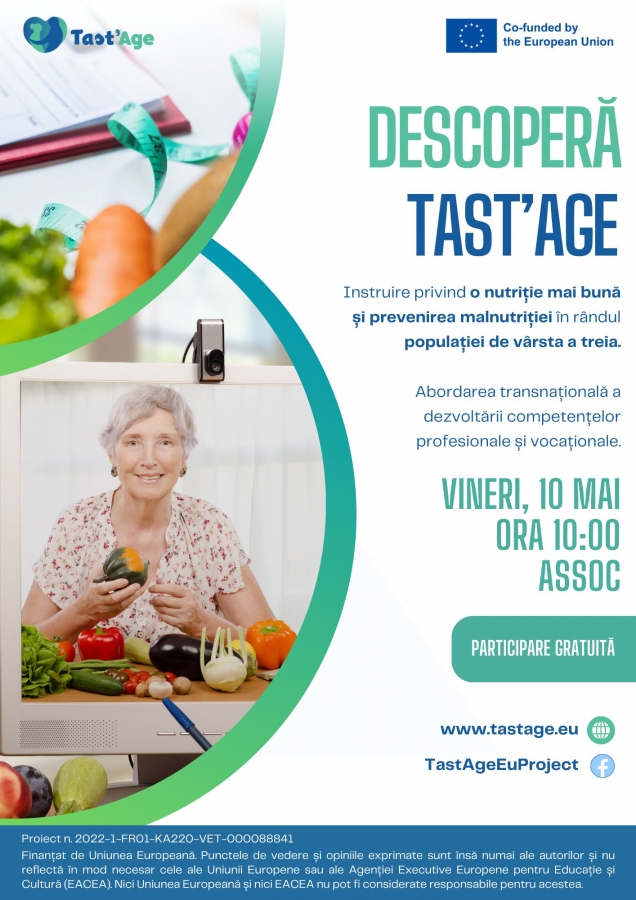 ASSOC organizează la începutul lunii mai un eveniment de instruire în cadrul proiectului Tast’Age care vizează alimentația vârstnicilor și la care vor fi prezenți specialiști în nutriție. Evenimentul ce va avea loc pe 10 mai 2024 va fi adresat persoanelor interesate să afle detalii despre programele alimentare recomandate seniorilor și cum pot fi ele adaptate pentru prevenirea malnutriției.