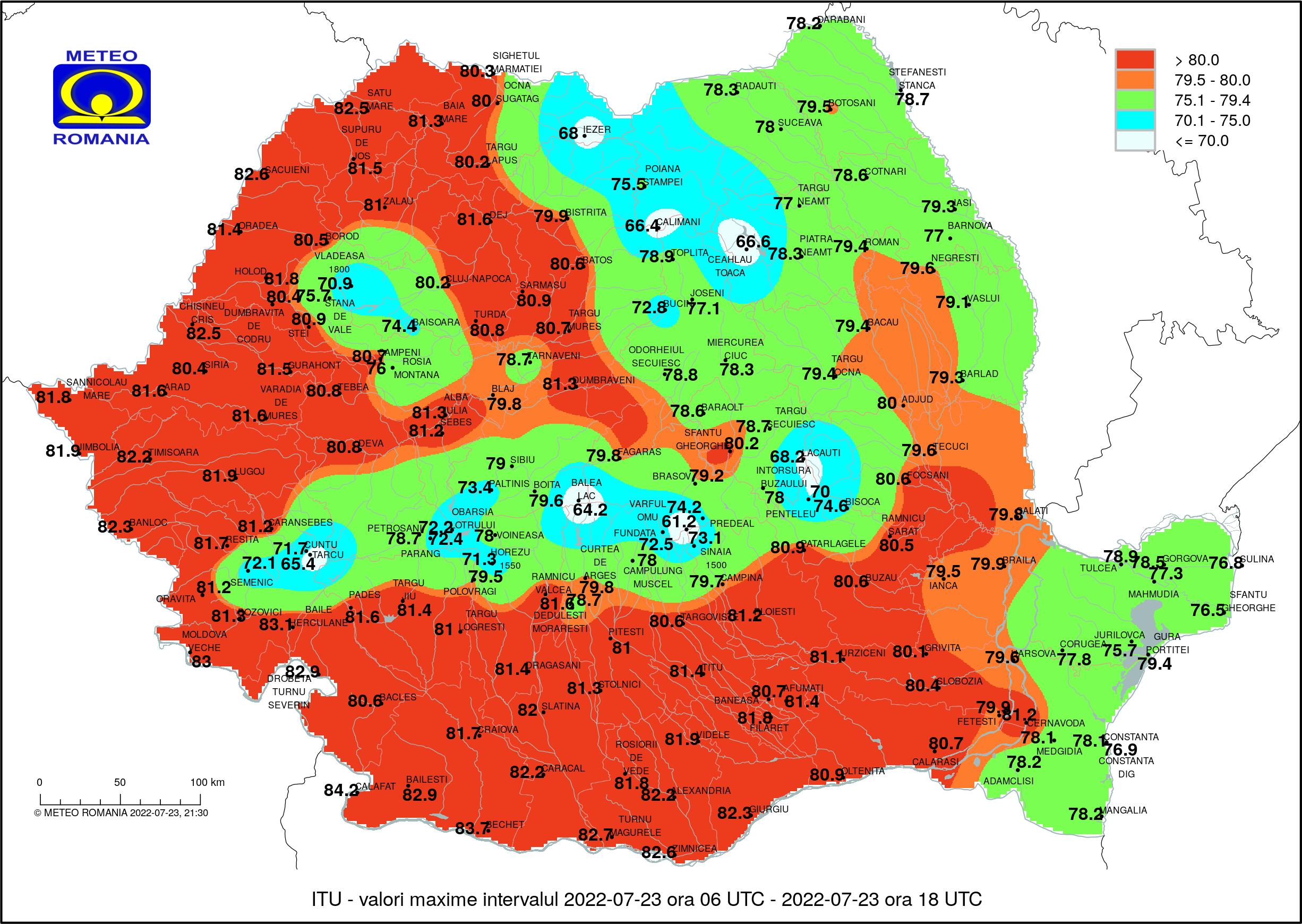 Maramureșul, aici ne referim la județul Maramureș, s-a aflat sub incidența unui cod portocaliu de caniculă, dar valorile termice maxime nu au fost foarte departe de cele din locurile în care am avut cod roșu. Maxima județeană s-a înregistrat la stația meteorologică Baia Mare, 37,4 grade, așadar cu doar 0,3 grade mai puțin decât în Zalău, unde era cod roșu. În Sighetu Marmației, maxima a fost de 36,5 grade, la Târgu Lăpuș de 35,8 grade, la Ocna Șugatag de 35 grade și la stația meteo Iezer de 22,9 grade. Totuși, recordul acestei veri în Maramureș este de 37,6 grade la stația meteo Baia Mare și s-a înregistrat în data de 1 iulie. Iar dacă vorbim despre recordul all-time al lunii iulie în județ, care este, de altfel, și recordul all-time vreodată măsurat în Maramureș, suntem categoric sub acesta. Recordul s-a înregistrat în 25 iulie 2012 și era de 39,5 grade, tot la stația meteo Baia Mare. Cu toate acestea, valorile termice resimțite sâmbătă, 23 iulie 2022, au ajuns până la 40 grade, cu precădere în Baia Mare și Sighetu Marmației. În valul de căldură din 30 iunie-1 iulie am avut și 41-42 grade temperatură resimțită. Indicele temperatură-umezeală a atins și depășit sâmbătă pragul critic de 80 unități la patru din cinci stații meteo, respectiv Baia Mare, unde a fost 81,3, Sighetu Marmației 80,3, Târgu Lăpuș 80,2 și Ocna Șugatag 80. La stația meteo Iezer, sub 70, dar este și normal, fiind în vârful muntelui. Recordul verii e tot din 1 iulie, 82,4 unități.