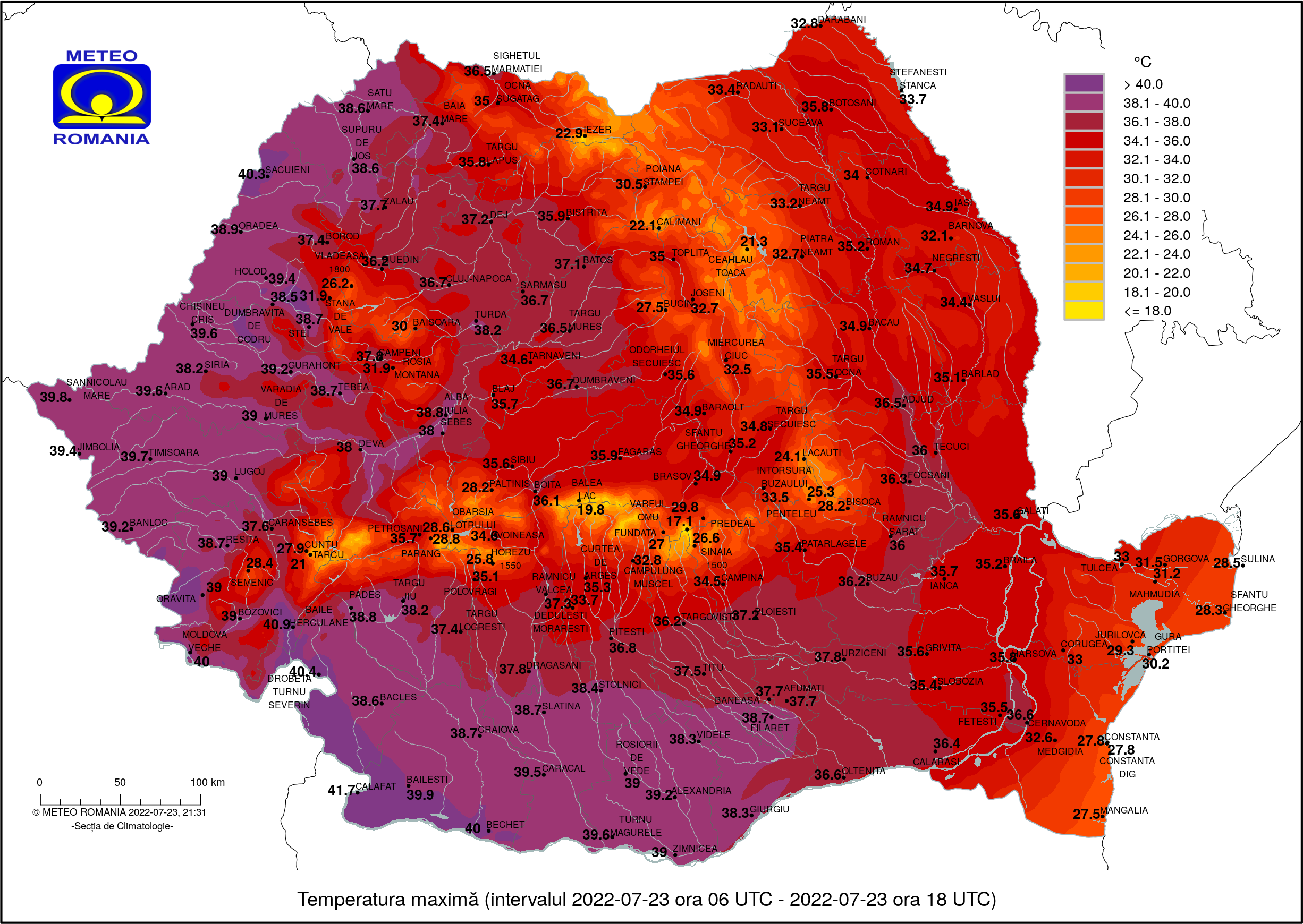 Maxima națională a zilei este 41,7 grade și s-a înregistrat la Calafat. De altfel, breteaua de vest a țării a bifat cele mai mari valori termice din țara noastră, în cursul zilei de sâmbătă. La Drobeta Turnu Severin s-au înregistrat 40,4 grade, la Timișoara și Arad, 39,7, respectiv 39,6 grade, la Oradea 38,9 grade, la Satu Mare 38,6 grade, iar la Zalău 37,7 grade. Maxima regiunii Nord-Vest s-a înregistrat la Săcuieni, Bihor, 40,3 grade, care și-a doborât recordul acestei veri, din 1 iulie, de 39,8 grade. Un fenomen interesant este la Șiria, în județul Arad, unde au fost 38,2 grade, dar în noaptea anterioară minima a fost de circa 27 grade, în condițiile în care la miezul nopții erau peste 30 grade. Datele sunt atât de neobișnuite, datorită poziționării stației meteo pe un deal, iar în aria respectivă fiind activ fenomenul de foehn. Toate acestea s-au aflat sub cod roșu.