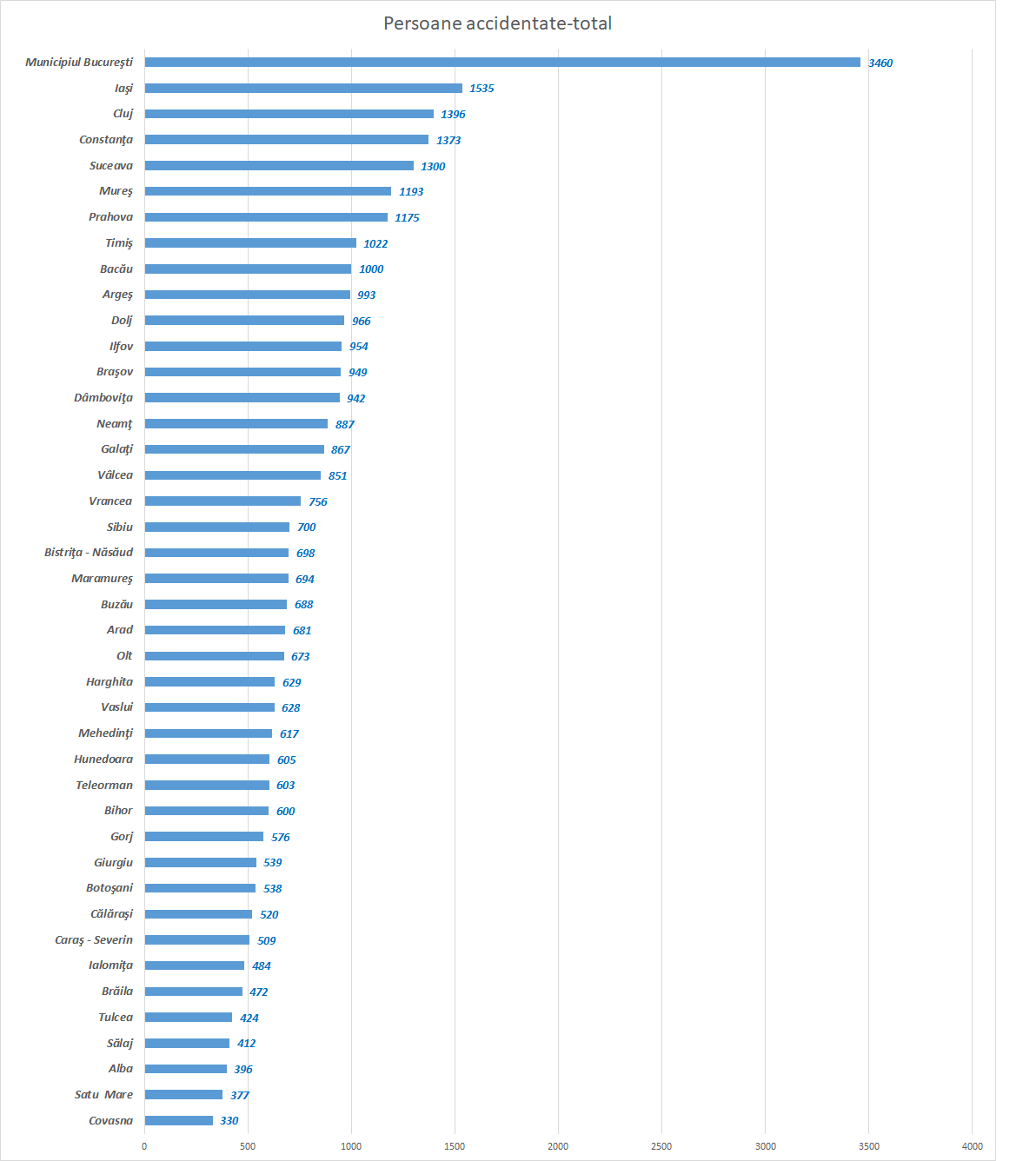 Să vedem care este situația în Maramureș! Județul nostru se află în țara noastră pe locul 21, deci la jumătatea clasamentului, cu 526. La nivel regional, Maramureșul se situează pe locul 3, după Cluj (2069) și Bistrița-Năsăud (565) și devansează, așadar, județele Bihor (446), Sălaj (306) și Satu Mare (296). La capitolul persoane accidentate, județul nostru este locul 21, de asemenea, cu 694, tot pe locul 3, după Cluj (1.396) și Bistrița-Năsăud (698) și devansează, așadar, județele Bihor (600), Sălaj (412) și Satu Mare (377). La capitolul persoane care au decedat, Maramureșul se află pe locul 32, cu 30, tot pe locul 3, după Cluj (60), Bihor (39) și devansează Satu Mare (30), Bistrița-Năsăud (27) și Sălaj (24).