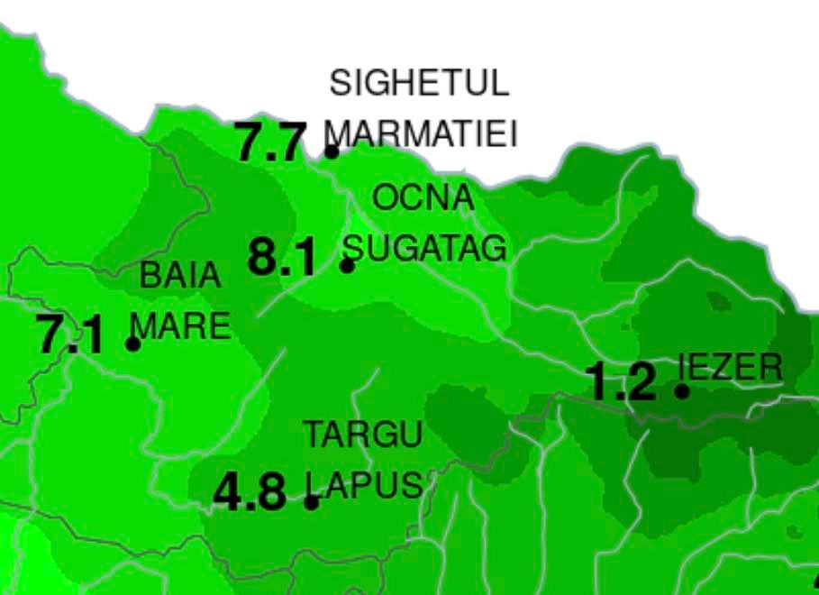 Dar iată că avem și reversul medaliei! Începutul acestei săptămâni a adus vreme foarte rece, și asta nu atât cât pe timpul zilei, cât să zicem că au mers la 20-22 grade, cât pe timpul nopții. Campioana inițială este noaptea de 11 către 12 iulie, când am avut 9,4 grade în Baia Mare, 9,6 grade în Sighetu Marmației, 7,8 grade în Ocna Șugatag, 6,7 grade în Târgu Lăpuș și 2 grade la stația meteo Iezer. Noaptea de 17 către 18 iulie a depășit-o, minimele fiind 7,1 grade în Baia Mare, 7,7 grade în Sighetu Marmației, 4,8 grade în Târgu Lăpuș, 8,1 grade în Ocna Șugatag și… minima absolută a verii acesteia, 1,2 grade la stația meteo Iezer.