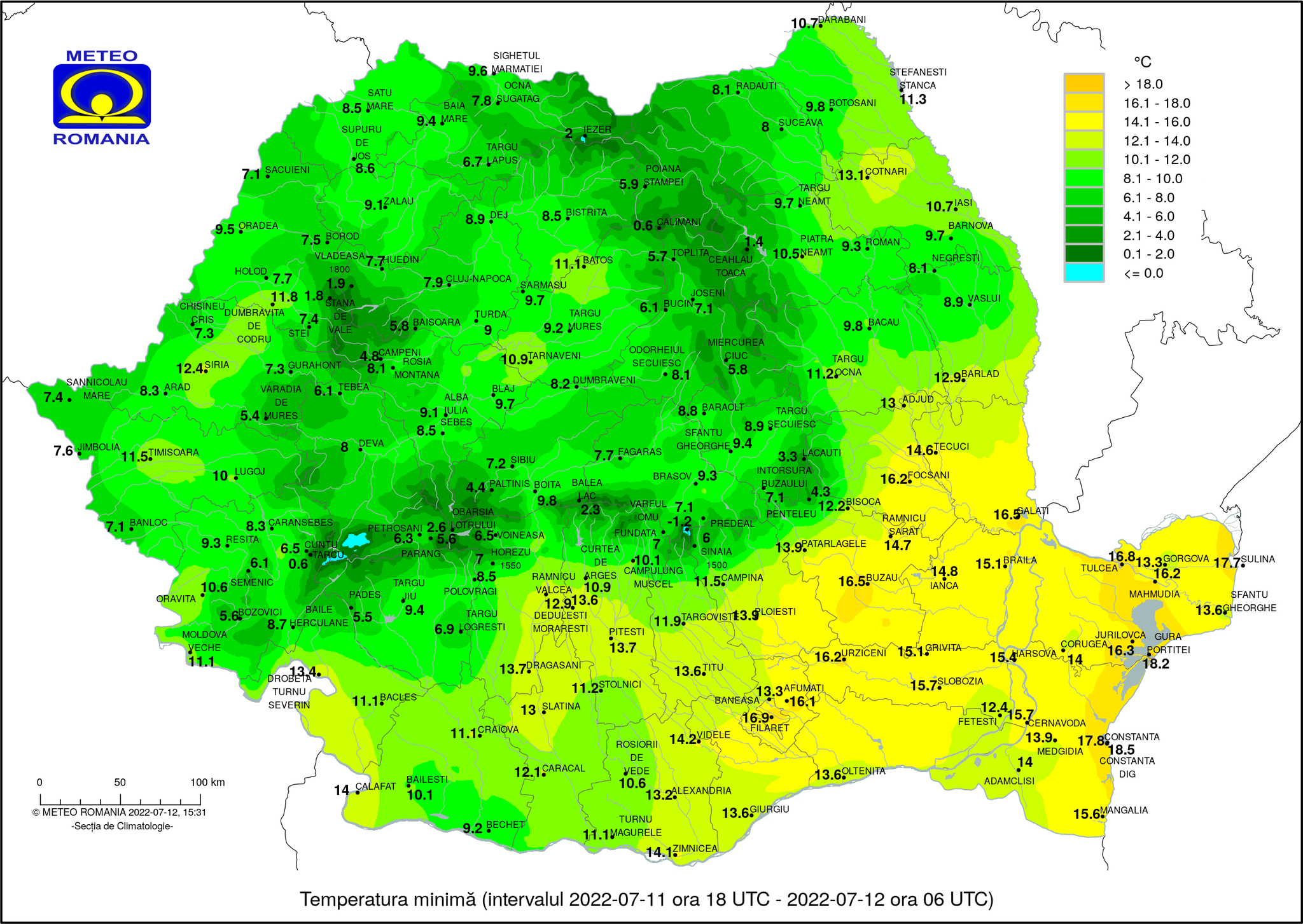 Dar iată că avem și reversul medaliei! Începutul acestei săptămâni a adus vreme foarte rece, și asta nu atât cât pe timpul zilei, cât să zicem că au mers la 20-22 grade, cât pe timpul nopții. Campioana este noaptea de 11 către 12 iulie, când am avut 9,4 grade în Baia Mare, 9,6 grade în Sighetu Marmației, 7,8 grade în Ocna Șugatag, 6,7 grade în Târgu Lăpuș și 2 grade la stația meteo Iezer.