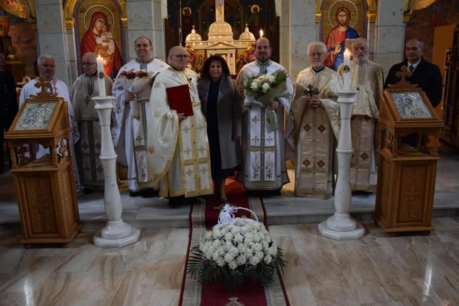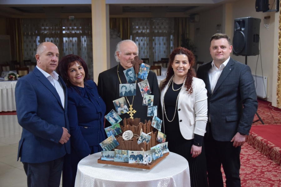 Părintele Gheorghe Pop a primit un coș cu 80 de garoafe albe și o diplomă de excelență din partea autorităților locale, iar din partea părintelui paroh și a corului frumoase buchete de flori și o plachetă aniversară.