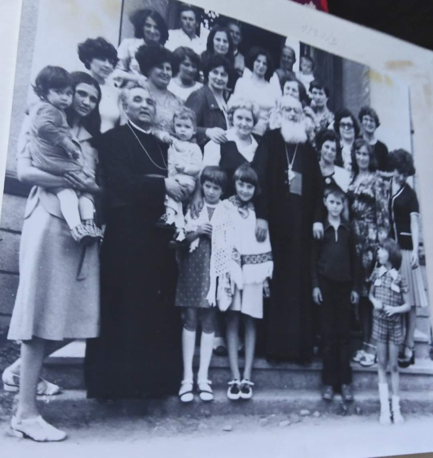 În imagine Vrednicul de pomenire TEOFIL HERINEANU, Arhiepiscopul Vadului Feleacului și Clujului, alături de familia părintelui paroh Salviu Cupcea, doamna preoteasă MARIA CUPCEA și alte persoane prezente la eveniment”.