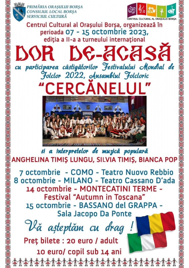 „Vă anunțăm cu entuziasm că Ansamblul Folcloric „Cercănelul” din cadrul Centrului Cultural Borșa, condus de Tomoioagă Antonia, coordonat fiind de coregraf Duli Babici Tudor și susținut de orchestră, dirijor Mihali Marius, vor porni în turneu internațional, ediția a-II-a. Astfel, ne vom da întâlnire cu borșenii noștri dragi, și nu numai.