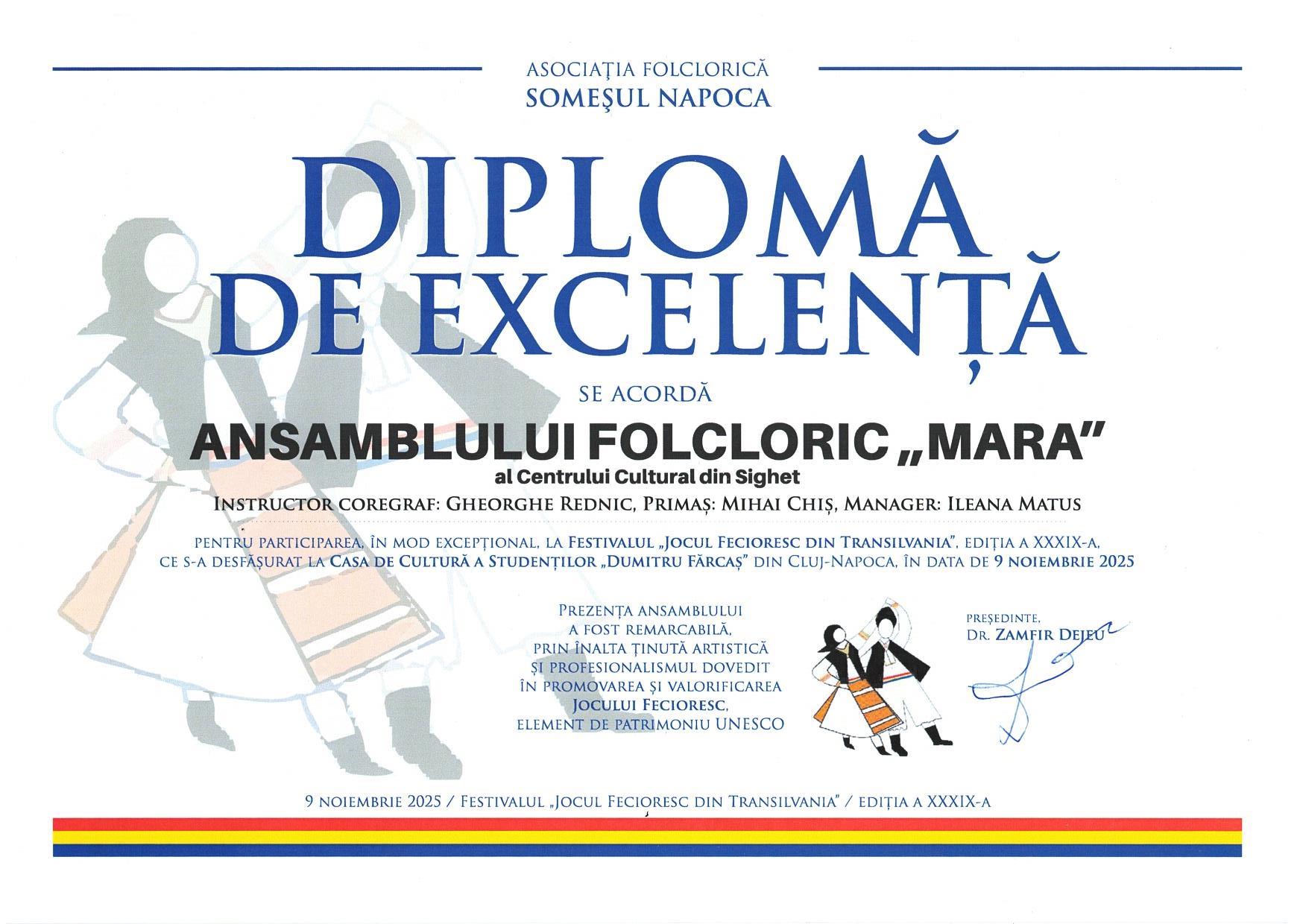 Ansamblul folcloric „MARA” al Centrului Cultural din Sighetu Marmației (coregraf Gheorghe Rednic, dirijor Mihai Chiș, manager Ileana Matus) a reprezentat cu cinste Maramureșul la cea de-a 39-a ediție a Festivalului „Jocul Fecioresc din Transilvania”, desfășurat duminică, 9 noiembrie, la Casa de Cultură a Studenților „Dumitru Fărcaș” din Cluj-Napoca.