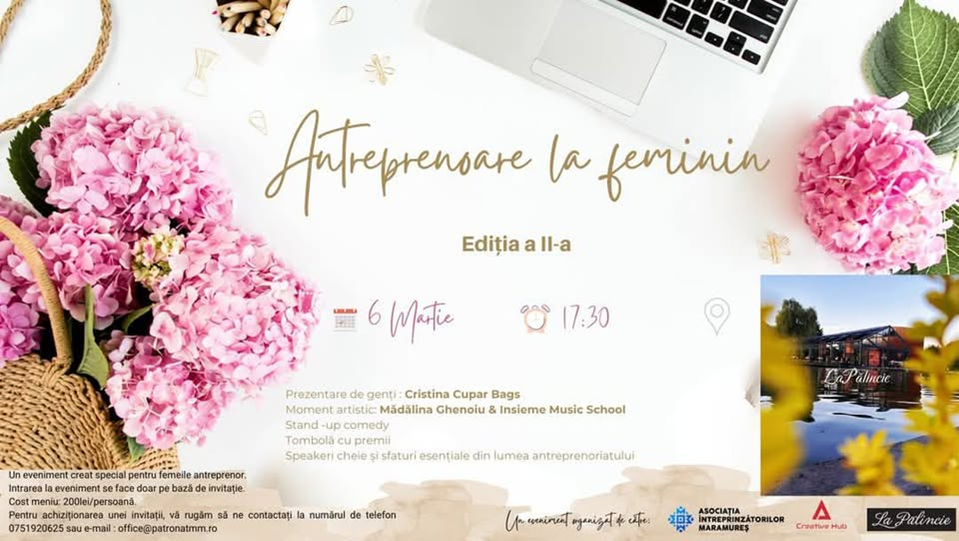 Asociația Întreprinzătorilor Maramureș organizează pe 6 martie 2025, la Pălincie, a doua ediție a evenimentului „Antreprenoare la Feminin”, dedicat femeilor din antreprenoriat care inspiră și inovează. Începând cu ora 17:30, evenimentul va celebra succesul și determinarea femeilor care au avut curajul să creeze și să conducă.