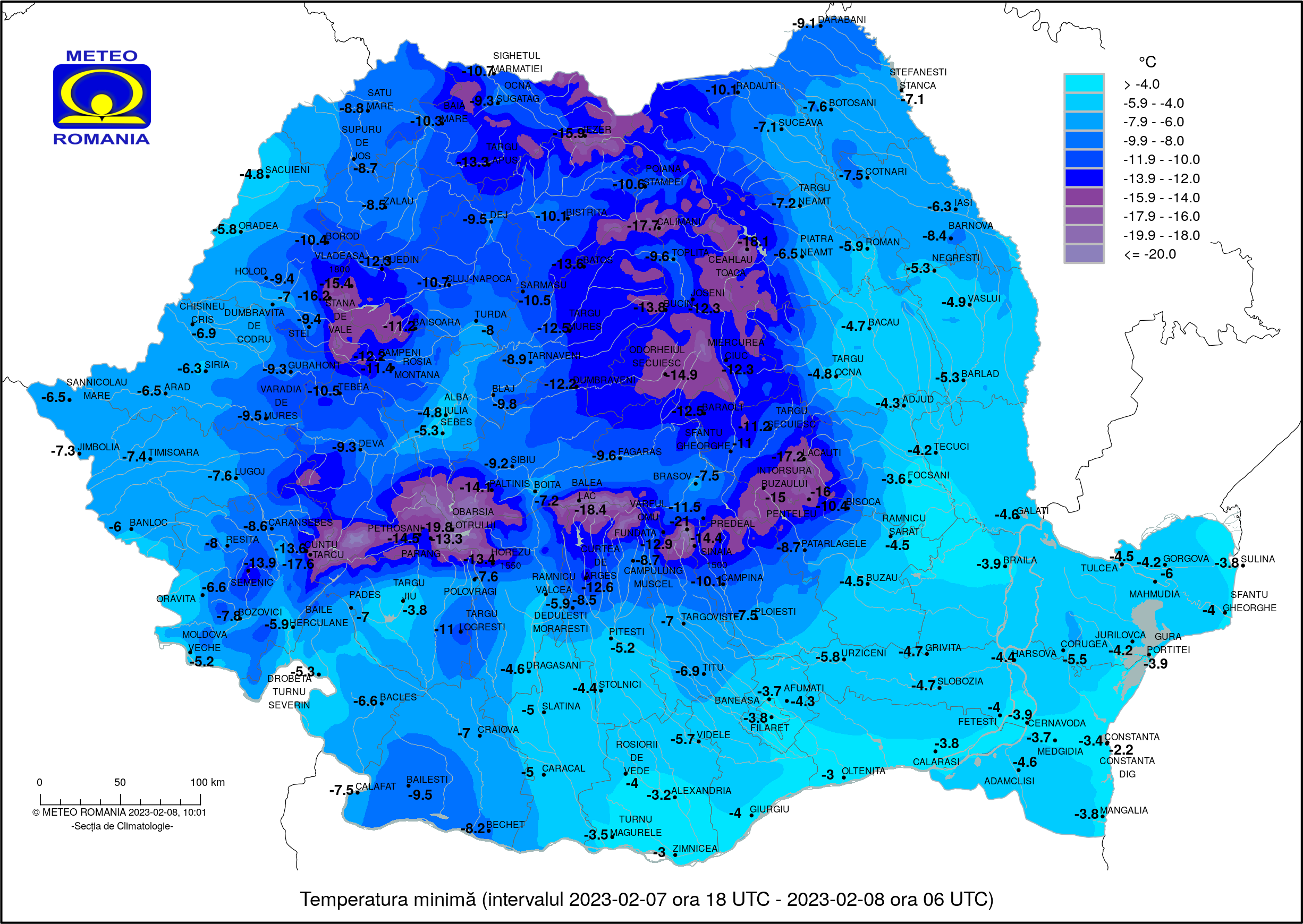 Astăzi vremea va fi rece, dar apropiată de normal, local geroasă în cursul dimineții și noaptea. Cerul va fi de la variabil la mai mult senin. Vântul va sufla în general slab. Temperaturile maxime vor fi cuprinse între -9, -7 și -5, -4 grade, doar la amiază, pentru scurt timp vor urca puțin către sau peste pragul de îngheț și la nivel local, iar cele minime vor fi cuprinse între -14, -13 și -9, -7 grade. Izolat, în zonele joase, vor fi condiții de ceață asociată și cu depunere de chiciură. Minima nopții de 7 către 8 februarie, -16 grade la stația meteo Iezer, în Munții Rodnei. La ora dimineții am avut următoarele valori: -13 grade la sta’ia meteo Iezer și Târgu Lăpuș, -12 grade în Pasul Prislop, -11 grade în Pasul Gutâi, -10 grade în Baia Mare, la Sighetu Marmației, Borșa și Baia Sprie, -9 grade la Ocna Șugatag și Cavnic.