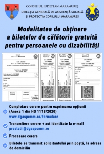 Beneficiază de gratuitatea transportului interurban, în România, la alegere, cu orice tip de tren, în limita costului unui bilet la tren interregio clasa a II-a, cu autobuzele sau cu navele pentru transport fluvial, următoarele categorii de persoane: persoanele cu handicap grav și accentuat; însoțitorii persoanelor cu handicap grav, numai în prezența acestora; asistenții personali ai persoanelor cu handicap grav; însoțitorii copiilor cu handicap accentuat, numai în prezența acestora; persoanele cu afecțiuni renale care necesită hemodializă; asistenții personali sau însoțitorii persoanelor cu handicap care necesită hemodializă. Anul trecut, 4.970 de persoane din Maramureș au beneficiat de 38.975 bilete de călătorie gratuită. Informații suplimentare cu privire la modalitatea de decontare a transportului pentru persoanele cu dizabilități pot fi obținute accesând pagina de internet www.dgaspcmm.ro.