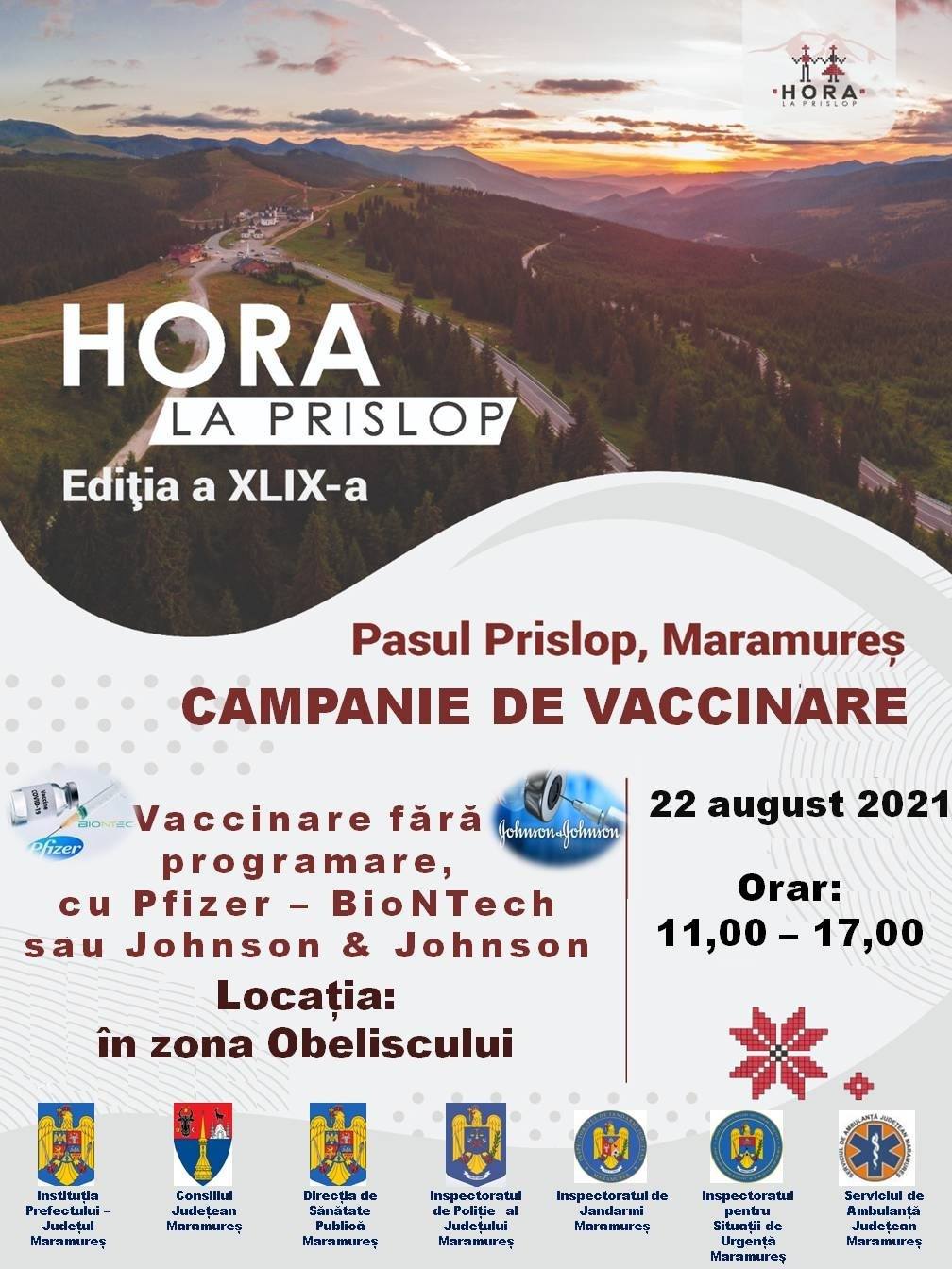 Instituția Prefectului-Județul Maramureș, Consiliul Județean Maramureș, Direcția de Sănătate Publică Maramureș, Inspectoratul pentru Situații de Urgență ”Gheorghe Pop de Băsești” al Județului Maramureș, Inspectoratul de Poliție al Județului Maramureș, Inspectoratul de Jandarmi Județean ”Pintea Viteazul” Maramureș și Serviciul de Ambulanță Județean Maramureș, organizează, duminică, 22 august a.c, în cadrul Festivalului Interjudețean de Folclor ”Hora la Prislop” o campanie de vaccinare a populației.