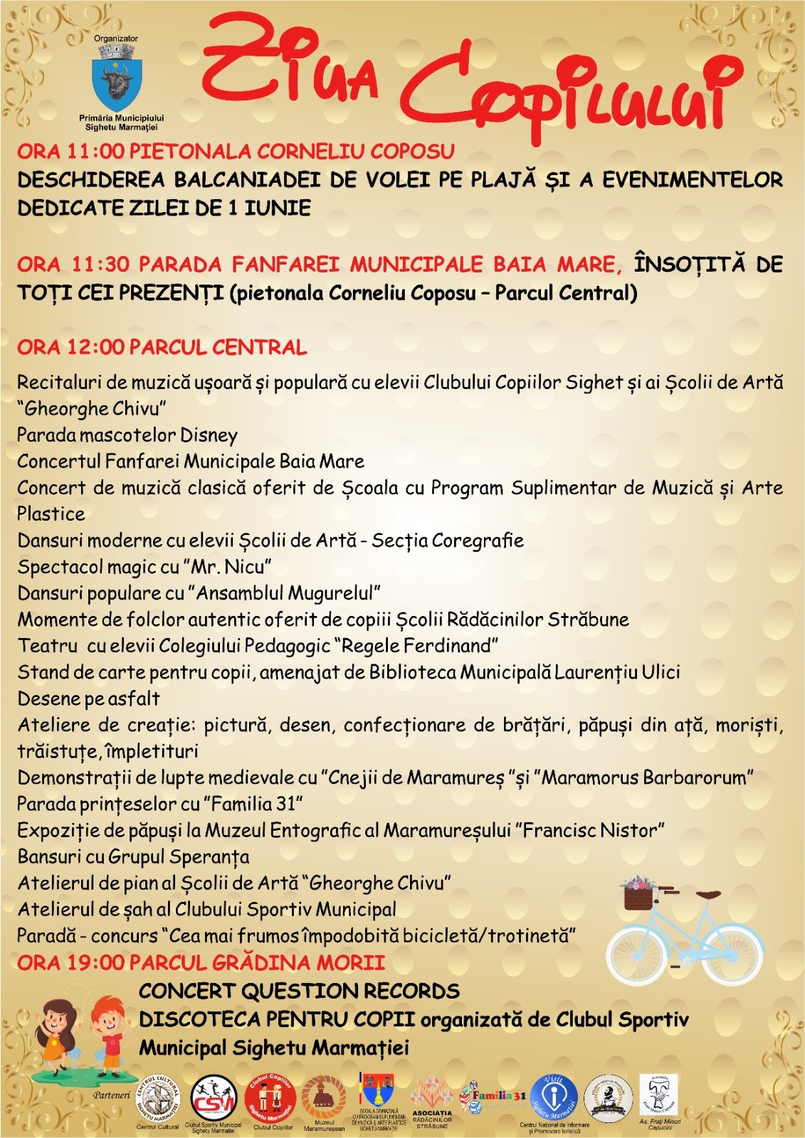 Începând cu ora 12:00 toţi copiii sunt invitaţi să participe la activităţile special pregătite pentru ei: diferite concursuri, ateliere de creație, dansuri și momente artistice interactive, desene pe asfalt, parada mascotelor și a prințeselor Disney, concerte de muzică clasică, ușoară și populară, teatru pentru copii, demonstrații de lupte medievale și multe alte surprize menite să aducă culoare și bucurie tuturor copiilor, mai mici sau mai mari. Odată cu lăsarea serii distracția se va muta în Parcul Grădina Morii unde începând cu ora 19:00 va avea loc un concert susținut de o trupa de tineri sigheteni Question Records, după care Clubul Sportiv Municipal Sighet invită toţi copiii la Discoteca pentru copii.