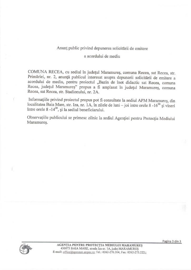 Anunț public privind depunerea solicitării de emitere a acordului de mediu