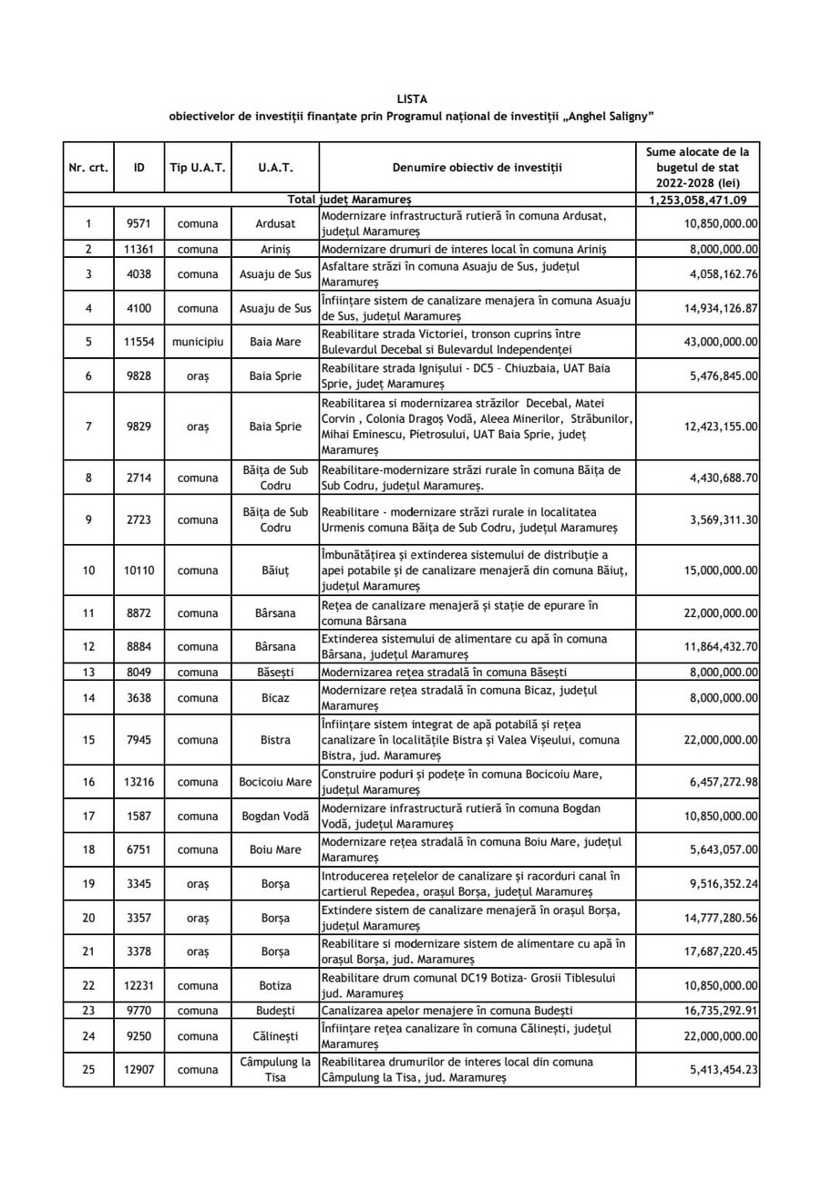 Lista obiectivelor de investiții în rețeaua de apă, canalizare și drumuri, finanțate de Ministerul Dezvoltării, prin Programul Național de Investiții ”Anghel Saligny”, a fost finalizată pentru încă patru județe, printre care și Maramureșul, arată Ministerul. Pentru județul Maramureș, ministerul va finanța 101 obiective de investiții, în valoare totală de 1.253.058.471,09 lei.