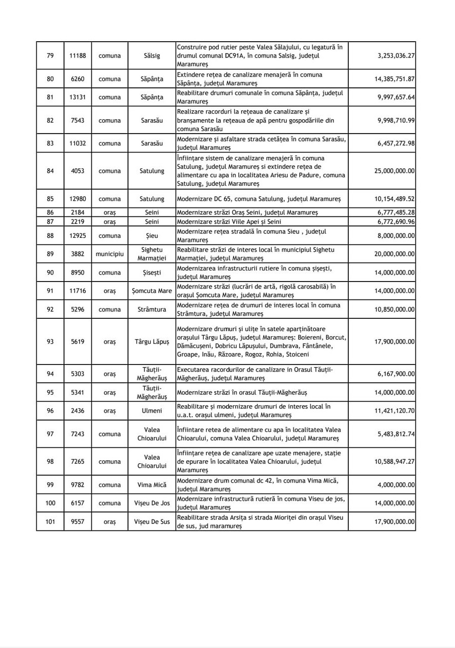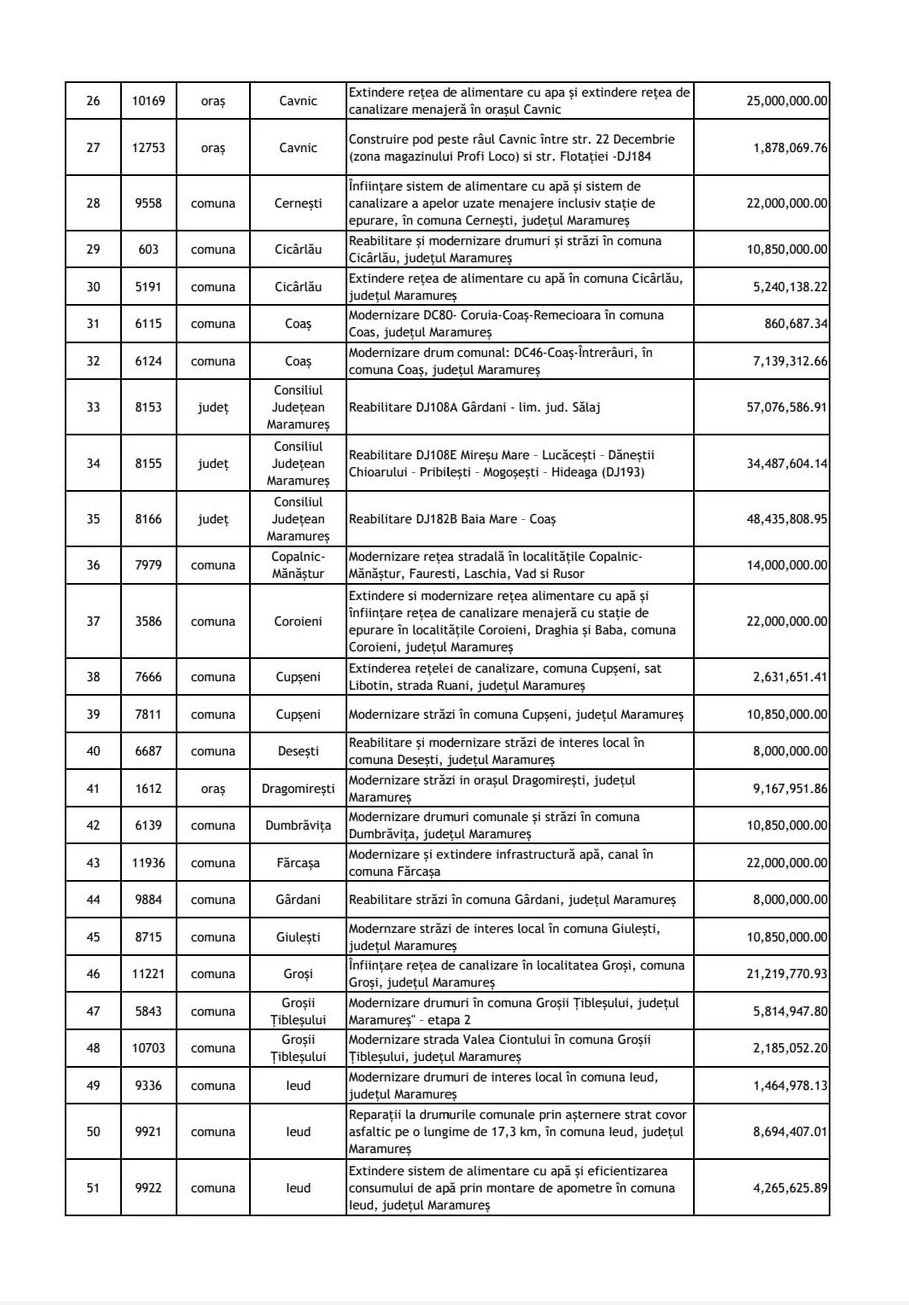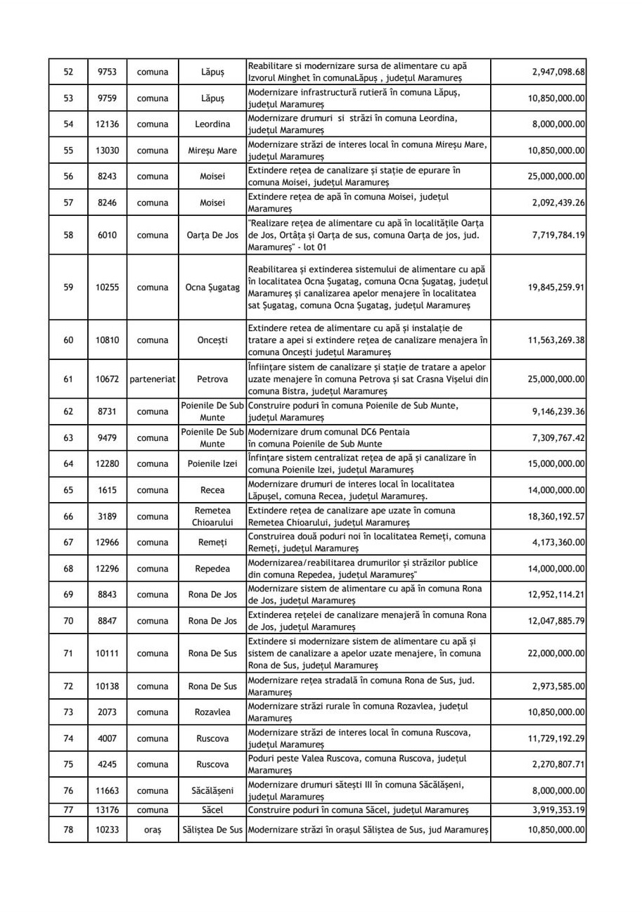 Iar acum observațiile aferente! Pe lista beneficiarilor avem 73 unități administrativ-teritoriale (UAT) din totalul de 76. Lipsesc Coltău, Suciu de Sus și Vadu Izei. Toate cele 73 (cele două municipii, 11 orașe, respectiv 60 comune) plus Consiliul Județean Maramureș se regăsesc cu cel puțin un obiectiv de investiții. Cele mai mari investiții, în conformitate cu alocarea pentru finanțare, sunt reabilitarea a două sectoare de drum județean, respectiv DJ 108A Gârdani – limită județul Sălaj (57.076.586,91 lei) și DJ 182B Baia Mare – Coaș (48.435.808,95 lei). Urmează un sector de șosea din reședința de județ Baia Mare. Este vorba despre un tronson din strada Victoriei, cuprins între bulevardele Decebal și Independenței, care va primi 43.000.000 lei. Urmează un nou tronson de drum județean, care va beneficia de reabilitare, mai exact DJ108E Mireșu Mare – Lucăcești – Dăneștii Chioarului – Pribilești – Mogoșești – Hideaga (DJ193), pentru care s-a alocat suma de 34.487.604,14 lei: Reabilitare DJ108E Mireșu Mare – Lucăcești – Dăneștii Chioarului – Pribilești – Mogoșești – Hideaga (DJ193). Cel mai mult pentru apă și canal primesc Cavnic și Moisei, fiecare câte 25.000.000 lei, Cavnicul, pentru extindere rețea de alimentare cu apa și extindere rețea de canalizare menajeră, iar Moisei pentru extindere rețea de canalizare și stație de epurare în comuna Moisei. Per total, orașul Borșa a primit cea mai mare sumă, dar ca și sumă pe cap de locuitor pe locul 1 se află orașul Cavnic. Vezi aici lista toată!