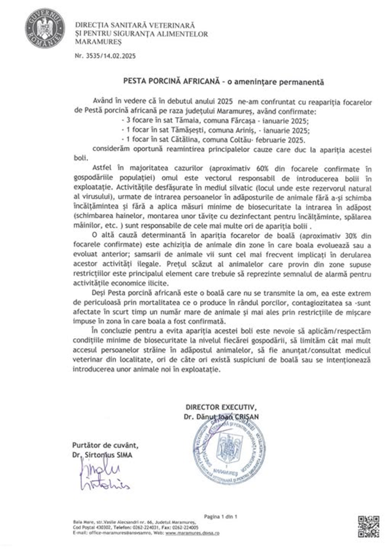 Pesta Porcină Africană (PPA) este o boală virală extrem de contagioasă, care afectează porcii domestici și mistreții, având un impact devastator asupra efectivelor de suine și provocând pierderi economice semnificative. Recent, Direcția Sanitară Veterinară și pentru Siguranța Alimentelor (DSVSA) a emis un comunicat de presă referitor la apariția PPA în zona Remetea Chioarului.