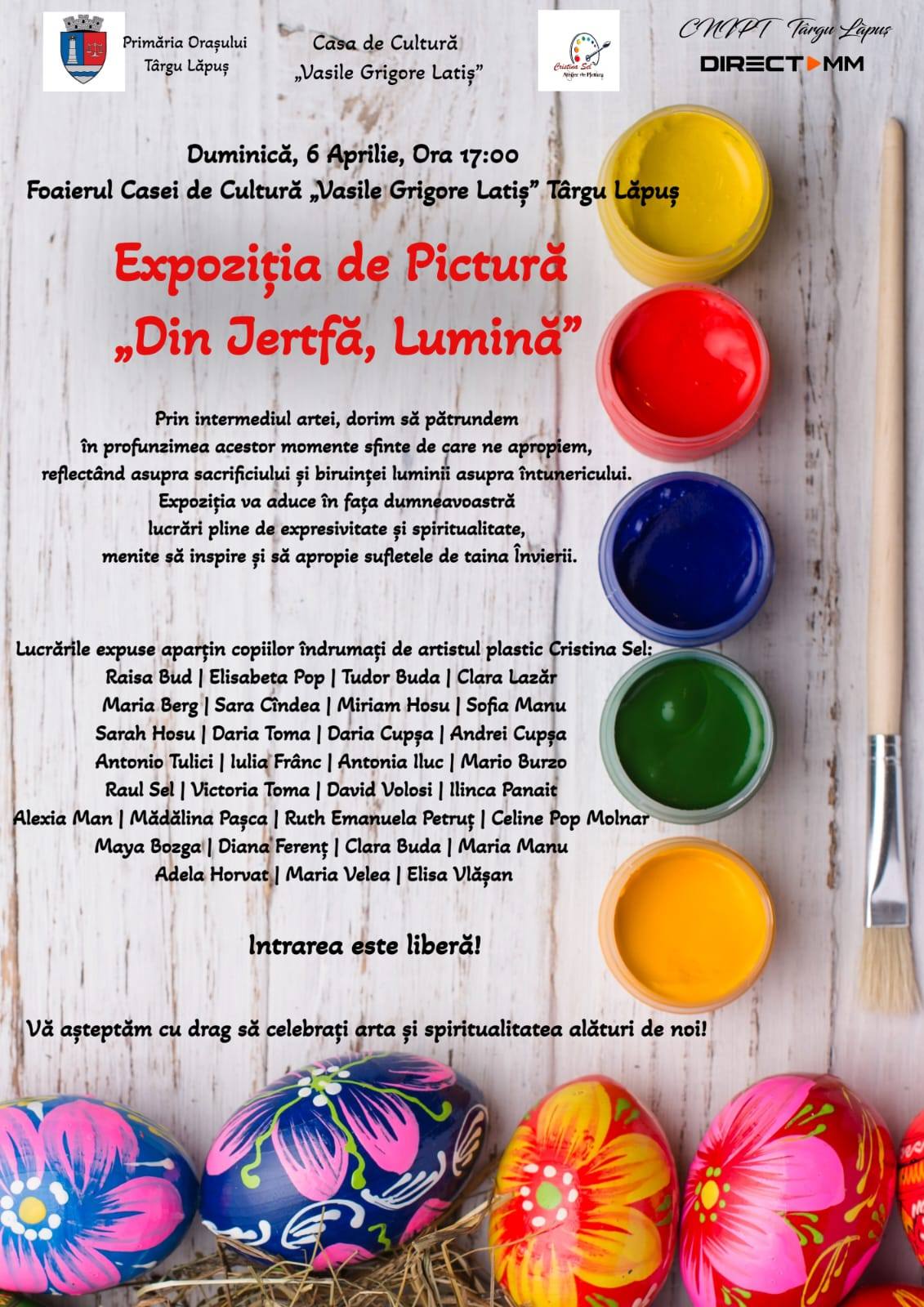 Expoziția de pictură va putea fi admirată în foaierul Casei de Cultură. Lucrările expuse aparțin cursanților Atelierului de Pictură din Târgu Lăpuș, îndrumați de artistul plastic Cristina Sel: Raisa Bud, Elisabeta Pop, Tudor Buda, Clara Lazăr, Maria Berg, Sara Cîndea, Miriam Hosu, Sofia Manu, Sarah Hosu, Daria Toma, Daria Cupșa, Andrei Cupșa, Antonio Tulici, Iulia Frânc, Antonia Iluc, Mario Burzo, Raul Sel, Victoria Toma, David Volosi, Ilinca Panait, Alexia Man, Mădălina Pașca, Ruth Emanuela Petruț, Celine Pop Molnar, Maya Bozga, Diana Ferenț, Clara Buda, Maria Manu, Adela Horvat, Maria Velea, Elisa Vlășan.