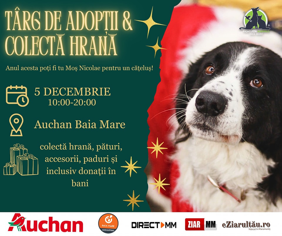 Asociația Fight For Animals din Baia Mare: Fii Moș Nicolae pentru un prieten blănos; Ediție specială de adopții și colectă de hrană, în 5 decembrie