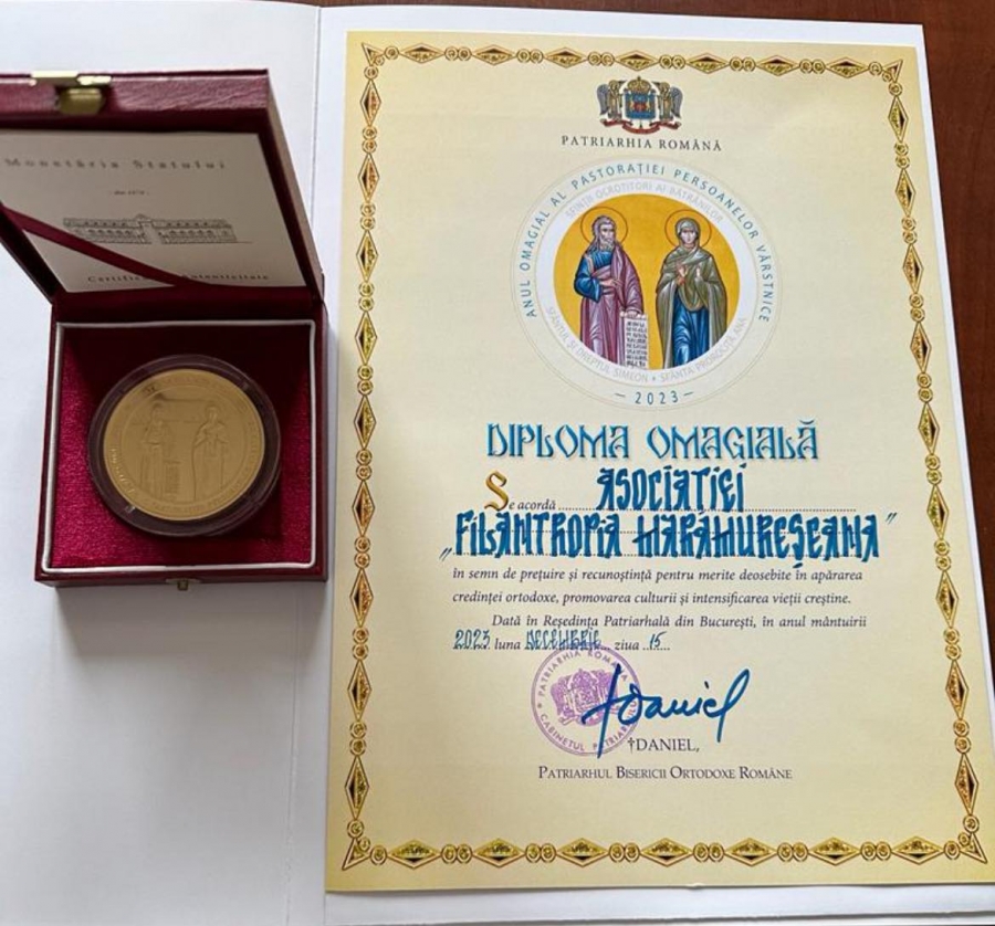 Asociația Filantropia Maramureșeană a primit din partea Patriarhului Daniel medalia și diploma anului omagial