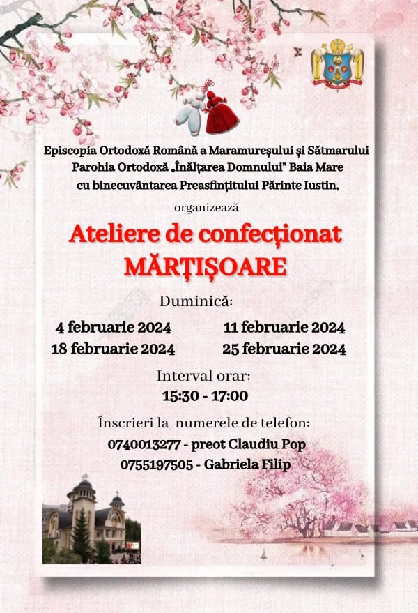Cu binecuvântarea Presfințitului Părintelui Iustin, Episcopul Maramureșului și Sătmarului, Parohia „Înălțarea Domnului” din Baia Mare (str. Victor Babeș, zona Spitalului TBC) organizează în toate duminicile din luna februarie „Ateliere de confecționat mărțișoare”.