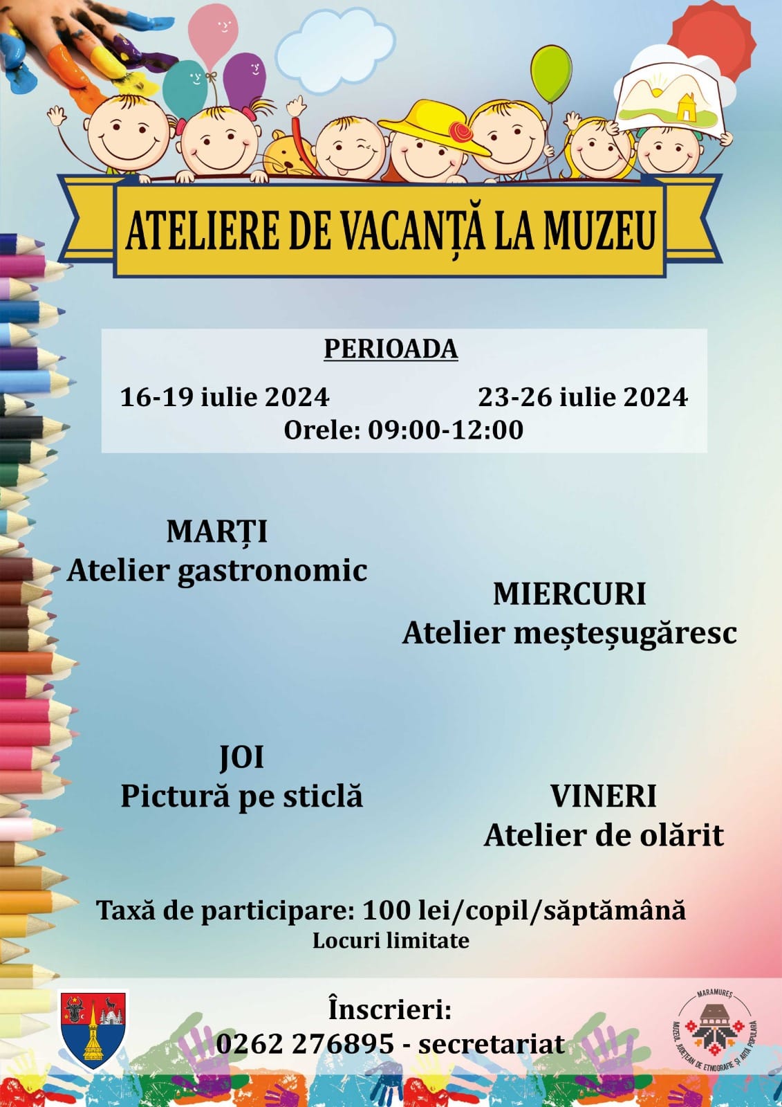 „Dragii noștri, știm că vă este dor să ne întâlnim la atelierele de vacanță organizate la Muzeul Satului din Baia Mare. Anul acesta vă așteptăm alături de noi în două serii, adică în perioada 16-19 iulie, respectiv 23-26 iulie, de marți până vineri, între orele 09.00 – 12.00. Atenție, locurile sunt limitate!