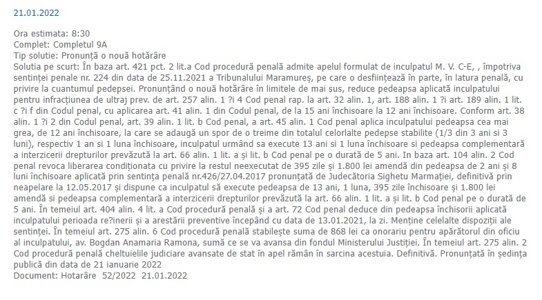 În 25 noiembrie el a fost condamnat la peste 16 ani de închisoare. Sentința însă nu a fost definitivă. Acum este. Și el este condamnat la 13 ani de închisoare. Iată soluția pe scurt! „În baza art. 421 pct. 2 lit.a Cod procedură penală admite apelul formulat de inculpatul M. V. C-E, , împotriva sentinţei penale nr. 224 din data de 25.11.2021 a Tribunalului Maramureş, pe care o desfiinţează în parte, în latura penală, cu privire la cuantumul pedepsei. Pronunţând o nouă hotărâre în limitele de mai sus, reduce pedeapsa aplicată inculpatului pentru infracţiunea de ultraj prev. de art. 257 alin. 1 ?i 4 Cod penal rap. la art. 32 alin. 1, art. 188 alin. 1 ?i art. 189 alin. 1 lit. c ?i f din Codul penal, cu aplicarea art. 41 alin. 1 din Codul penal, de la 15 ani închisoare la 12 ani închisoare. Conform art. 38 alin. 1 ?i 2 din Codul penal, art. 39 alin. 1 lit. b Cod penal, a art. 45 alin. 1 Cod penal aplica inculpatului pedeapsa cea mai grea, de 12 ani închisoare, la care se adaugă un spor de o treime din totalul celorlalte pedepse stabilite (1/3 din 3 ani si 3 luni), respectiv 1 an si 1 luna închisoare, inculpatul urmând sa execute 13 ani si 1 luna închisoare si pedeapsa complementară a interzicerii drepturilor prevăzută la art. 66 alin. 1 lit. a şi lit. b Cod penal pe o durată de 5 ani. In baza art. 104 alin. 2 Cod penal revoca liberarea condiţionata cu privire la restul neexecutat de 395 zile şi 1.800 lei amendă din pedeapsa de 2 ani şi 8 luni închisoare aplicată prin sentinţa penală nr.426/27.04.2017 pronunţată de Judecătoria Sighetu Marmaţiei, definitivă prin neapelare la 12.05.2017 şi dispune ca inculpatul să execute pedeapsa de 13 ani, 1 luna, 395 zile închisoare şi 1.800 lei amendă si pedeapsa complementară a interzicerii drepturilor prevăzută la art. 66 alin. 1 lit. a şi lit. b Cod penal pe o durată de 5 ani. În temeiul art. 404 alin. 4 lit. a Cod procedură penală şi a art. 72 Cod penal deduce din pedeapsa închisorii aplicată inculpatului perioada re?inerii şi a arestării preventive începând cu data de 13.01.2021, la zi. Menţine celelalte dispoziţii ale sentinţei. În temeiul art. 275 alin. 6 Cod procedură penală stabileşte suma de 868 lei ca onorariu pentru apărătorul din oficiu al inculpatului, av. Bogdan Anamaria Ramona, sumă ce se va avansa din fondul Ministerului Justiţiei. În temeiul art. 275 alin. 2 Cod procedură penală cheltuielile judiciare avansate de stat în apel rămân în sarcina acestuia. Definitivă. Pronunţată în şedinţa publică din data de 21 ianuarie 2022”, se arată în soluția pe scurt.