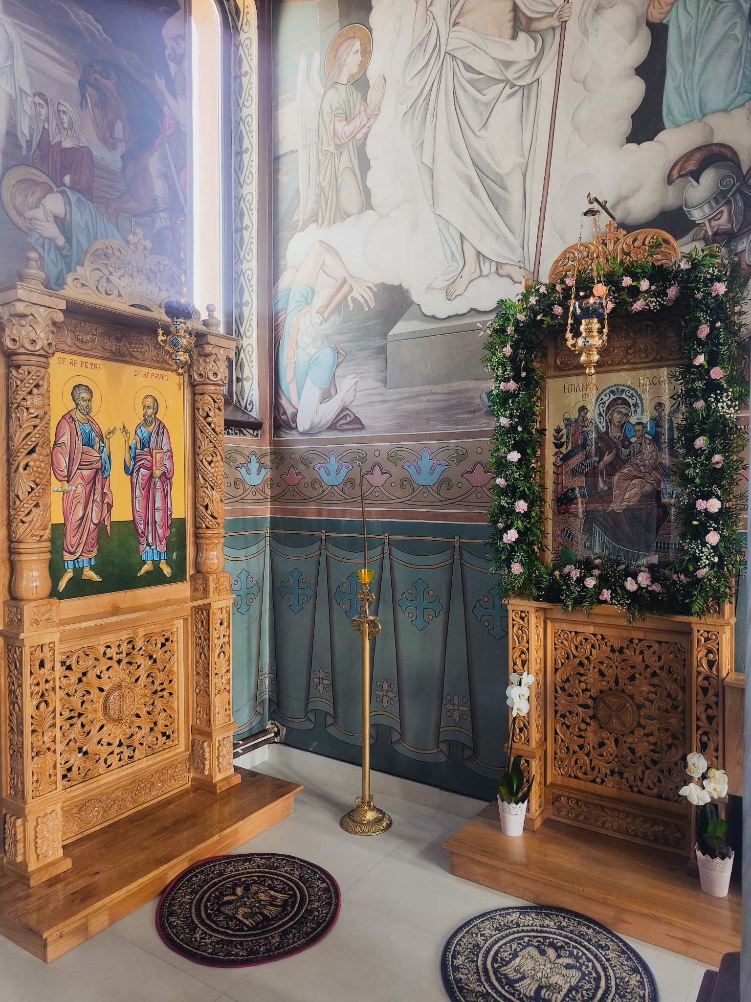 După cum se poate observa în fotografii, se respectă culorile liturgice: la Axionița Maicii Domnului este candelă albastră cu vultur albastru – culoarea împărătească a Maicii Domnului, o culoare sacră, care ne aduce aminte de credincioșia Mariei și de rolul ei privilegiat în istoria mântuirii, iar la Axionița Sfinților Petru și Pavel, candelă roșie cu vultur roșu – culoarea muceniciei și a sângelui, pe care cei doi Apostoli au preaslăvit pe Dumnezeu.