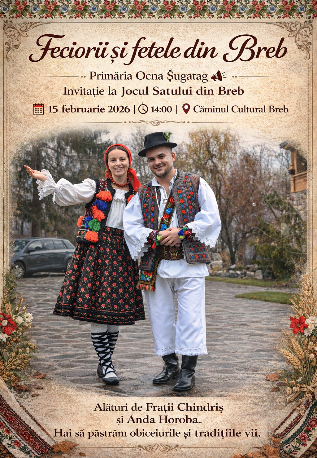 Breb se pregătește de sărbătoare. Feciorii și fetele din comună sunt invitați să participe la Jocul Satului, un eveniment dedicat păstrării obiceiurilor și tradițiilor populare, care va avea loc sâmbătă, 15 februarie, de la ora 14:00, la Căminul Cultural.