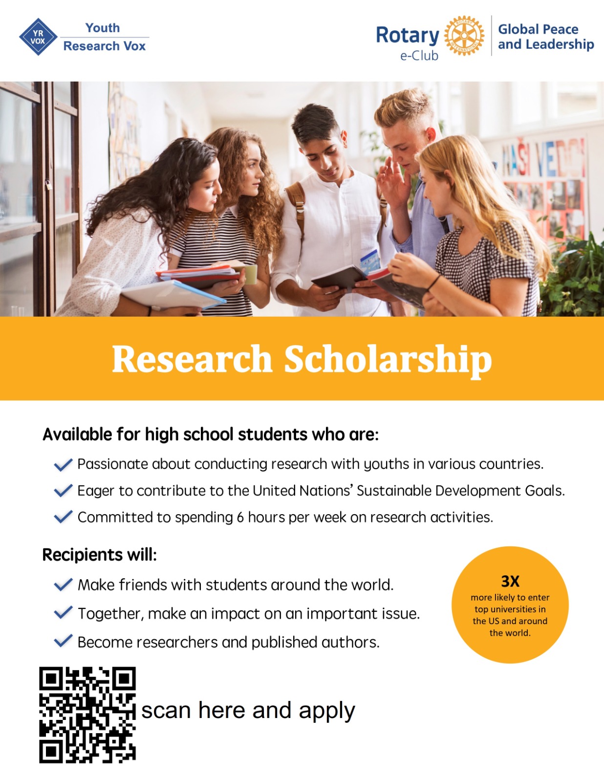 Rotary e-Club of Global Peace and Leadership din districtul nostru, este unul dintre cele 6 cluburi partenere la nivel global ce vor oferi burse de școlarizare unui număr de 18 tineri ce vor fi selectați în cadrul programului online 2023 – 2024 Youth Reserach Vox (https://www.youthresearchvox.org) coordonat de Clubul Rotary Alhambra din Districtul 5300, California, USA.