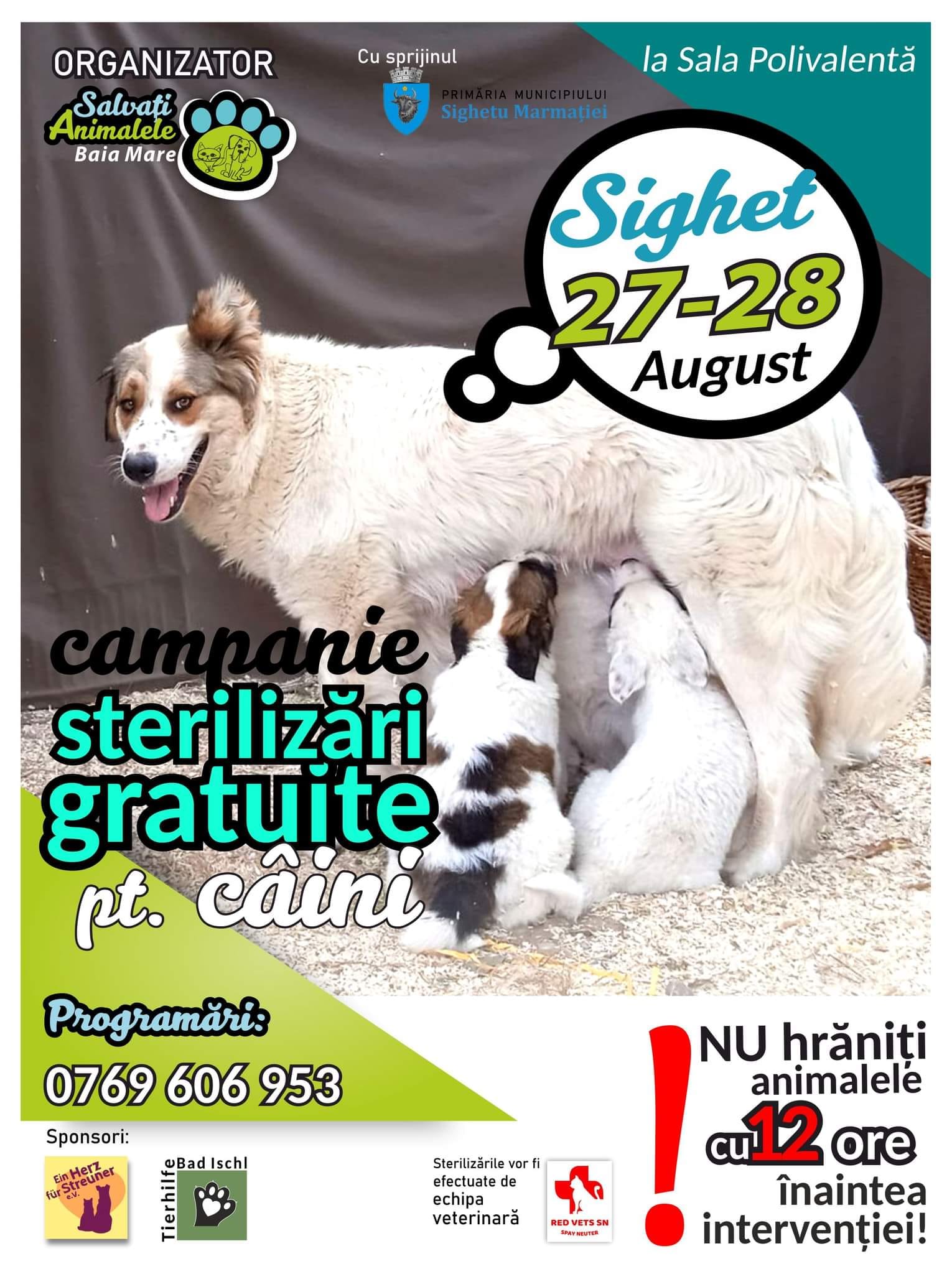„Vă rugăm să programați câinii, deoarece există o obligativitatea legală de castrare pentru aceștia, altfel proprietarii pot fi sancționați cu amenzi de până la 10.000 lei. Mulțumim Primăriei Sighetu Marmației pentru sprijinul acordat și sponsorilor Ein Herz für Streuner e.V. și Tierhilfe Bad Ischl fără de care această campanie nu avea loc!! Intervențiile chirurgicale se vor efectua de către echipa Red Vets Spay/Neuter. Nu hrăniți animalele cu 12 ore înainte de intervenția chirurgicală! Pentru programări vă rugăm să apelați numărul de telefon: 0769 606 953”, arată reprezentanții Salvați Animalele.