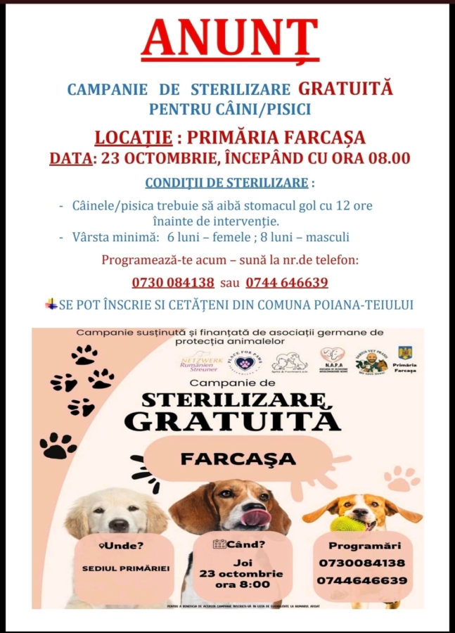 În 23 octombrie 2025, la Primăria Comunei Fărcașa va avea loc campania gratuită de sterilizare a cățeilor și pisicilor, pentru cetățenii din comuna Fărcașa și Poiana Teiului, începând de la ora 08:00.