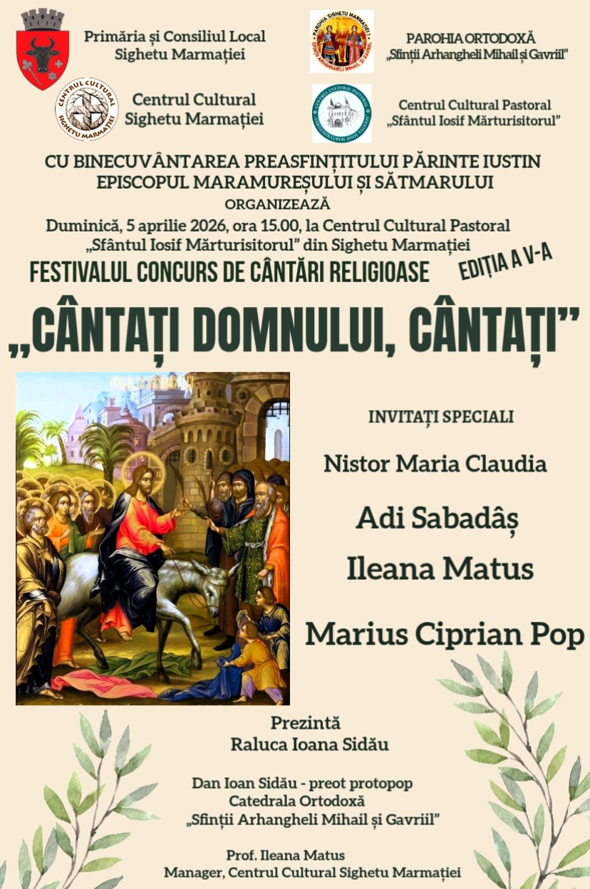 Duminică, 5 aprilie, de la ora 15:00, la Centrul Cultural Pastoral „Sfântul Iosif Mărturisitorul” din Sighetu Marmației va avea loc cea de-a V-a ediție a Festivalului-Concurs de Cântări Religioase „Cântați Domnului, cântați”.
