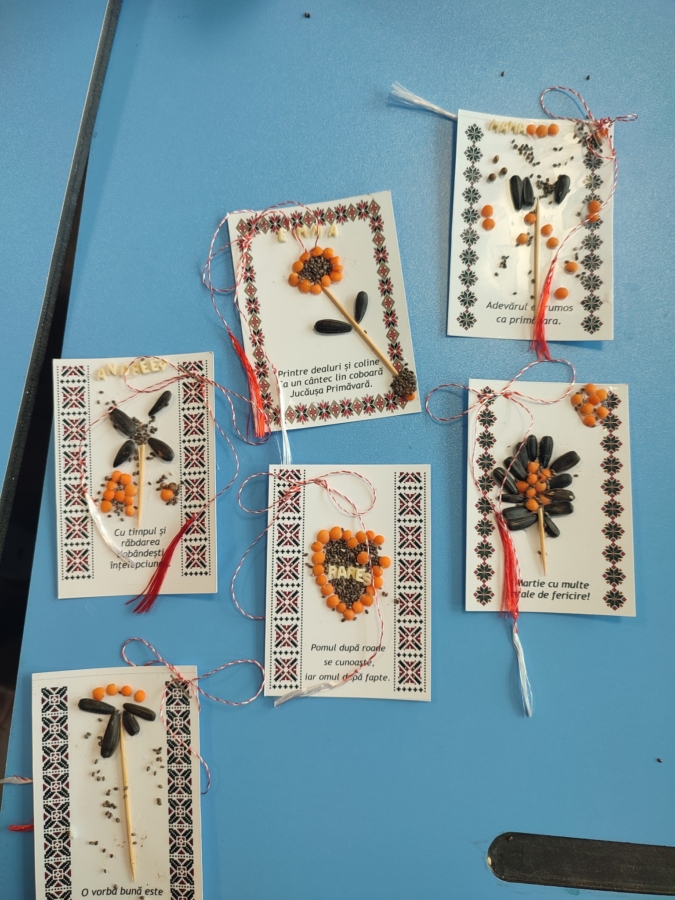 La partea practică, cei mici au meșteșugit mărțișoare cu multă atenție și imaginație, gândite să aducă bucurie și zâmbete pe chipul mamelor. Au folosit materiale simple, regăsite în gospodărie – semințe, linte, tăieței – iar rezultatul a fost o colecție de podoabe simpatice, fiecare după personalitatea celui care le-a creat.