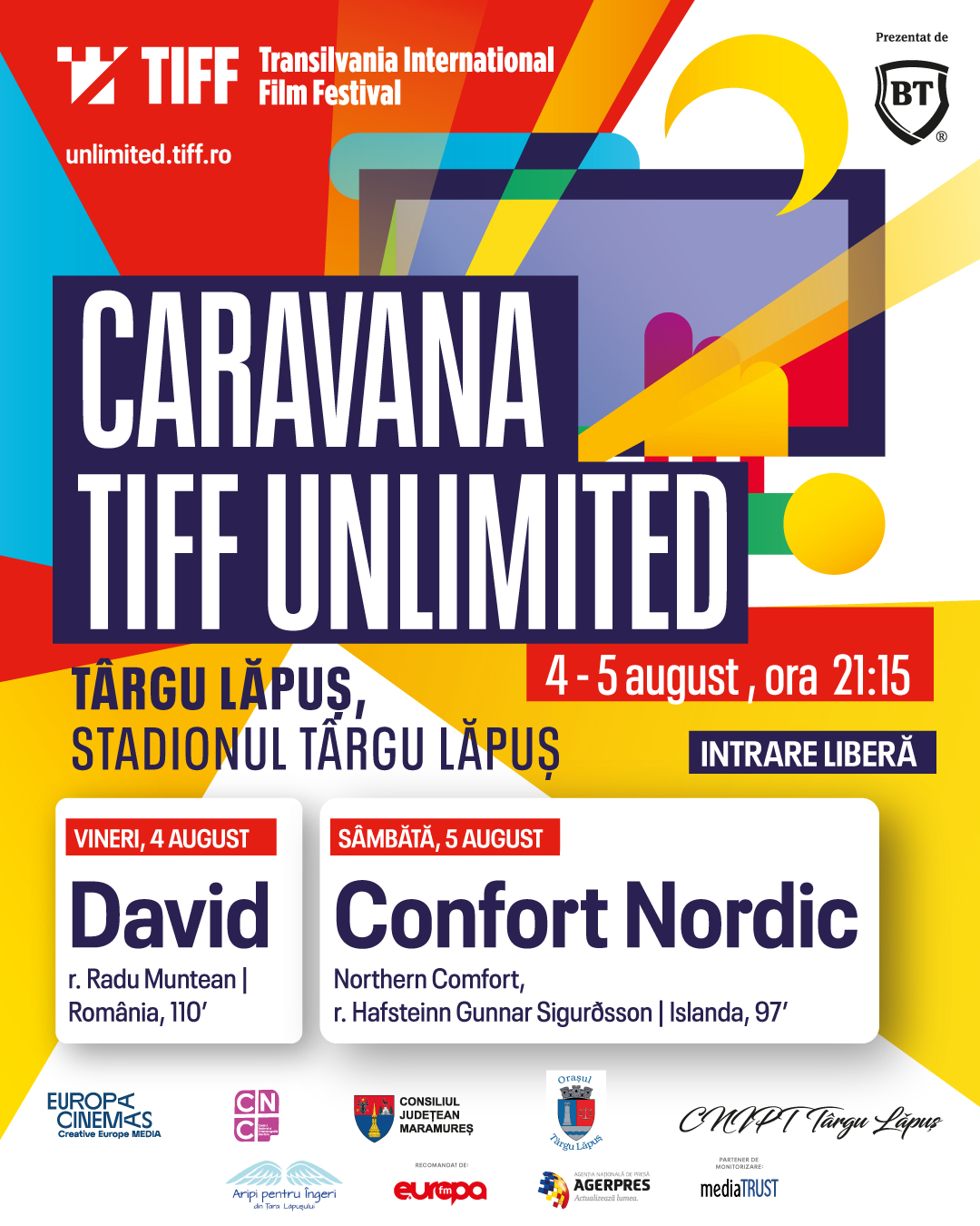 Este vorba despre documentarul „David”, care redă o tabără de vară, cu peripeții de tot felul, cu umor și spirit de echipă, respectiv filmul de deschidere a celei de-a 22-a ediție TIFF, „Confort Nordic / Northern Comfort”. Proiecțiile vor avea loc începând cu ora 21,15, pe stadionul din Târgu Lăpuș. Intrarea este liberă.