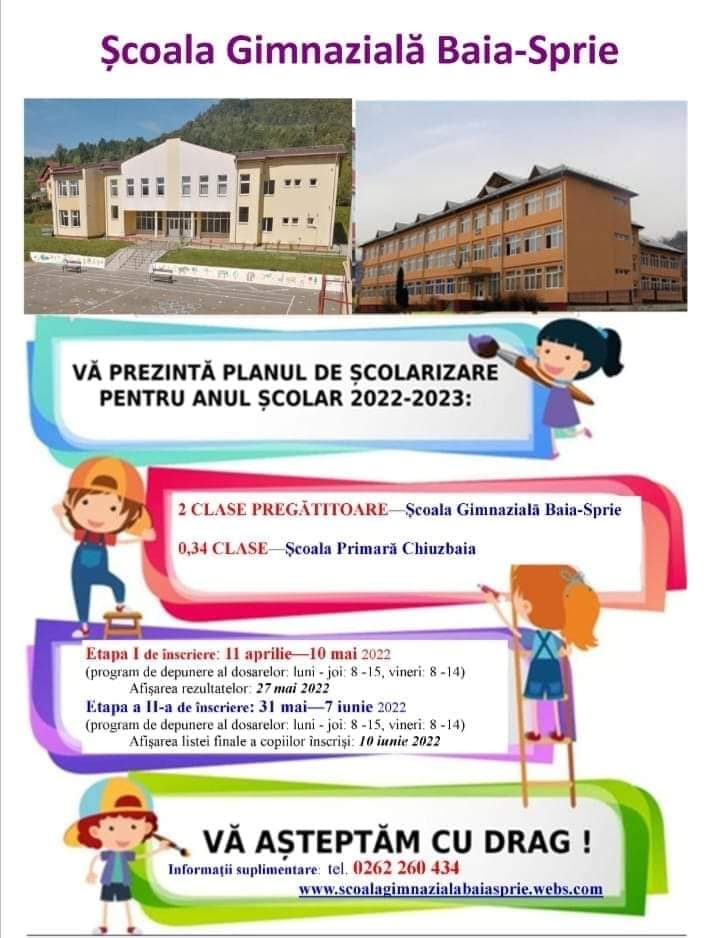 Dacă doriți să aflați mai multe despre Școala Gimnazială Baia-Sprie, trebuie să știți că evenimentul are loc între orele 14.00 – 17.00. Dacă doriți să aflați mai multe despre Liceul Tehnologic de Transporturi Auto, trebuie să știți că evenimentul are loc în intervalul 15.00 – 17.00. Detalii atașate!