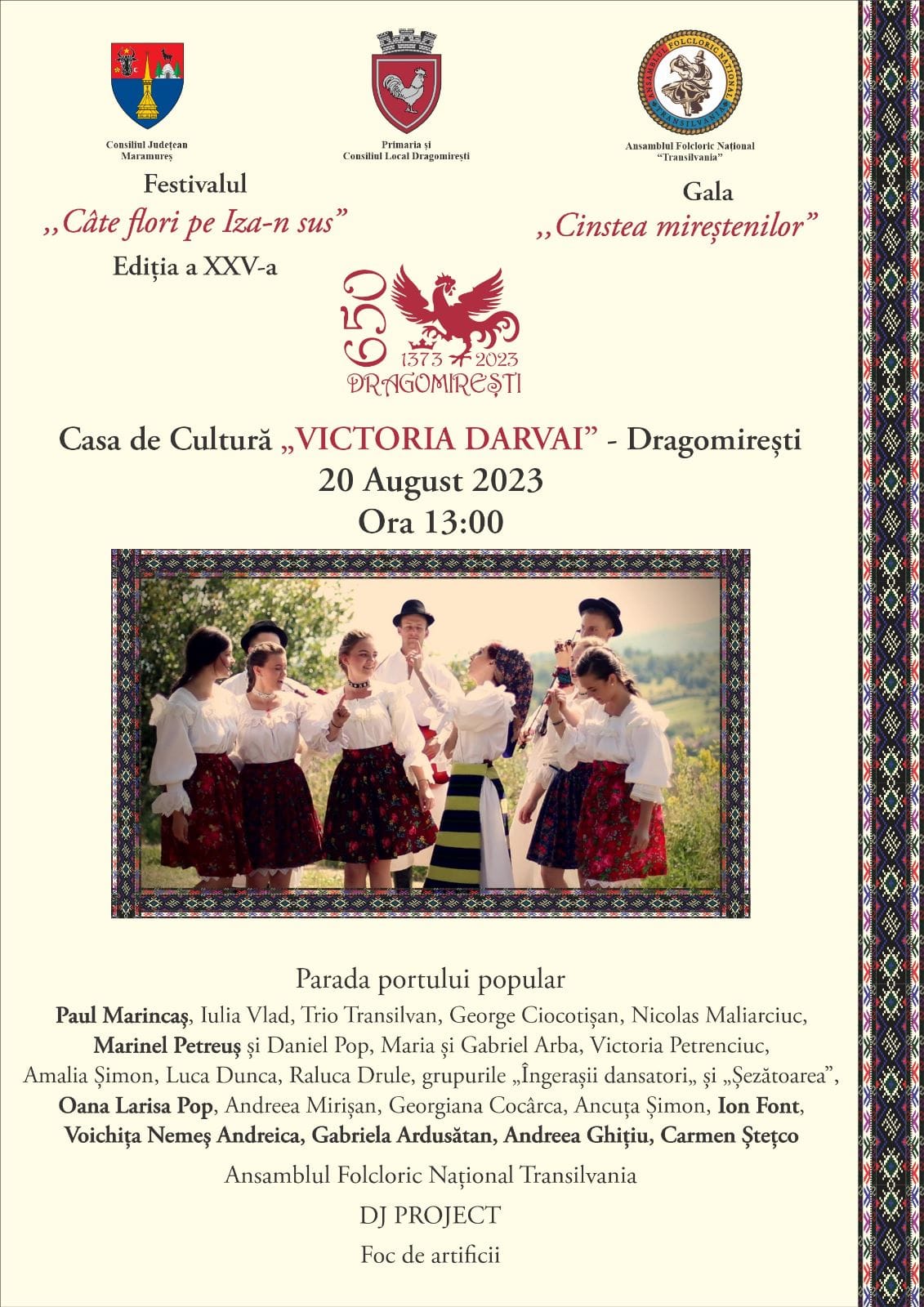 Duminică, 20 august 2023, va avea loc cea de-a 25-a ediție a Festivalului „Câte flori pe Iza-n sus”, în Dragomirești și, totodată, va avea loc și Gala „Cinstea mireștenilor”.