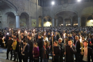 Credincioşii, veniţi în număr foarte mare la Catedrala Episcopală, au primit Sfânta Lumină direct din mâinile Întâistătătorului Eparhiei, Preasfinţitul Părinte Episcop Iustin, care i-a îndemnat să ia Lumina după o tradiţie foarte veche a Bisericii Ortodoxe.