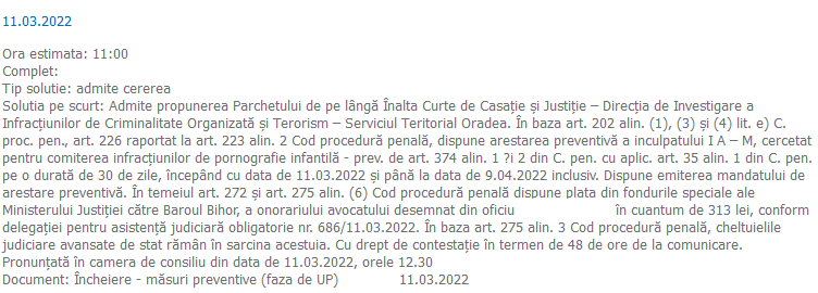 De asemenea, au fost identificate un număr de 57 fișiere cu fotografii în care sunt prezentate persoane minore de sex feminin în ipostaze sexuale cu caracter explicit, fiind identificată utilizarea unei aplicații peer-to-peer pentru descărcarea unor fișiere multimedia in mod anonim. În urma propunerii formulate de procurorii Direcției de Investigare a Infracțiunilor de Criminalitate Organizată și Terorism – Serviciul Teritorial Oradea judecătorul de drepturi și libertăți din cadrul Tribunalului Bihor a dispus la data de 11.03.2022 arestarea preventivă a inculpatului pe o perioadă de 30 de zile. Acțiunea a beneficiat de sprijinul polițiștilor din cadrul Brigăzii de Combatere a Criminalităţii Organizate Oradea și Serviciului pentru Acțiuni Speciale din cadrul I.P.J. Bihor. Facem precizarea că pe întreg parcursul procesului penal persoanele cercetate beneficiază de drepturile și garanțiile procesuale prevăzute de Codul de Procedură Penală, precum și prezumția de nevinovăție, arată DIICOT.